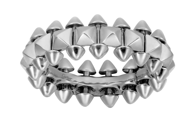 Après l’or rose, le maillage cranté de Clash explore l’or gris : bagues et bracelets qui peuvent s’emboîter et se superposer, dans toutes les versions.