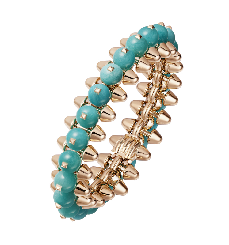 Après le corail et ses premières versions joaillières en éditions limitées, Clash ose le turquoise de l’amazonite, entre picots d’or rose et boules aux tons bleu lagon.