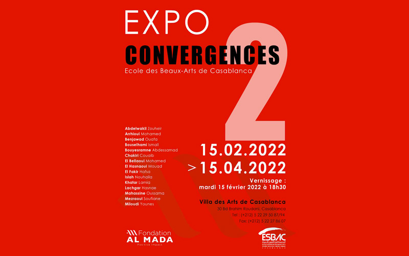 Direction la Villa des Arts de Casablanca. Du 15 février au 15 avril, la Fondation AL MADA, en partenariat avec l’école supérieure des beaux-arts (ESBAC) de Casablanca, présente l’exposition collective « Convergences 2 ». Sur les murs, les œuvres des jeunes artistes lauréats de l’ESBAC depuis 2010. Parmi eux, Abdelwakil Zouheir, Arrhioui Mohamed, Benjawad Ouafa, Bouselhami Ismail, Bouyesramne, Abdessamad, Chakiri Couaib, El Bellaoui Mohamed, El Hasnaoui Mouad, El Fakir Hafsa, Islah, Nouhaila, Khatar Lamia, Lachgar Hasnae, Mahassine Oussama, Mezraoui Soufiane et Miloudi Younes.