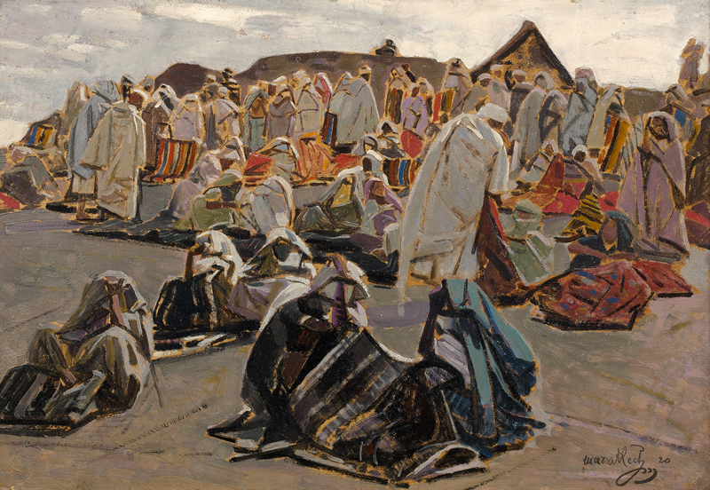 D’autres belles adjudications marquent cette session, à l’exemple des oeuvres d’Etienne Dinet Fillettes dansant : 3 571 000 MAD / 340 000 € frais inclus, Le conscrit : 2 331 000 MAD / 221 900 € frais inclus, ou encore celles de Jacques Majorelle avec Ouarzazate : 2 207 000 MAD / 210 000 € frais inclus, et les Couvertures noires : 1 430 000 MAD / 136 100 € frais inclus. Rahmouna, huile sur toile d’Alexandre Roubtzoff est adjugée à 858 000 MAD / 82 700 € frais inclus. Le chapitre Majorelle et ses Contemporains enregistre 26 M MAD / 2,5 M € frais inclus !
