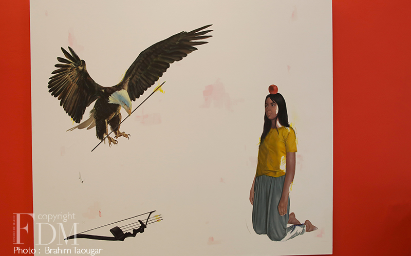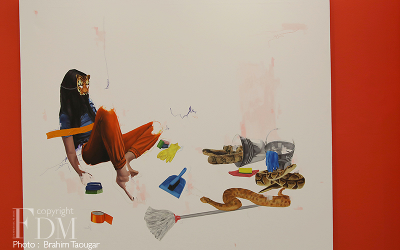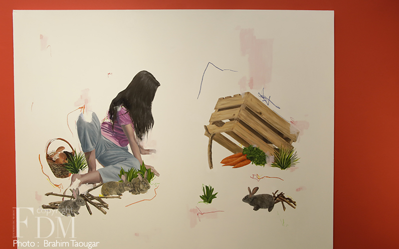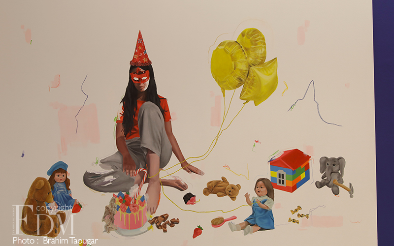 “Les thématiques du jeu et de l’enfance sont au cœur de la pratique dessinée de Rahma Lhoussig. Dans ses mises en scène ludiques, l’enfant tisse une trame faite de scénarios, d’acteurs, d’images, qui représentent ce qui n’est pas nécessairement là physiquement. Autrement dit, ces jeux figurent autre chose que ce qu’ils sont. À partir de ce constat, l’artiste vise à doter le monde imaginaire d’une force et d’une réalité : il s’agit ici de traduire la psyché humaine en tant qu’expérience sensorielle, soit en termes de notions abstraites rendus palpables à travers des objets, des formes, des figures et des couleurs. Objets inanimés ou bestiaire doué de vie, tous ces éléments génériques – a priori de l’ordre du quotidien -, sont ici pourvus d’un pouvoir apotropaïque et prophylactique, c’est-à-dire d’un effet protecteur et guérisseur. Dans le même temps, des rôles multiples leur sont attribués, qu’ils jouent au gré des scénarios imaginés. Éparpillés comme un jeu de piste ou imbriqués comme un casse-tête à résoudre, ils participent dans leur éclectisme à placer l’œuvre sous le signe du fabuleux et de l’onirique.”