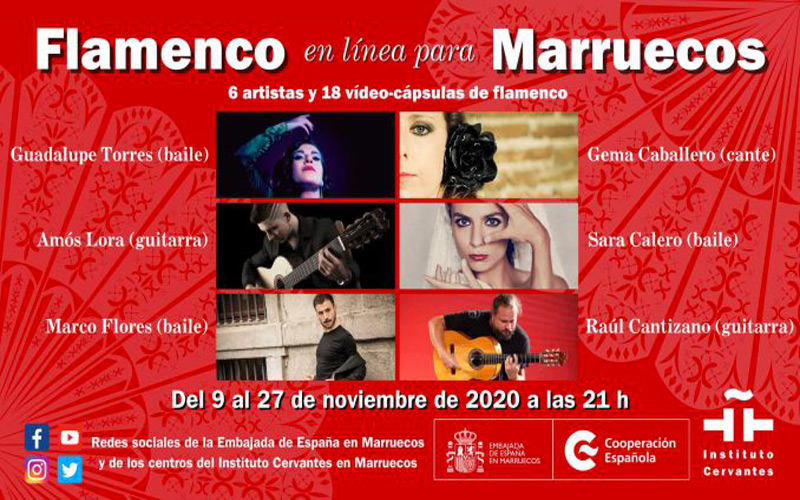 18 capsules audiovisuelles de flamenco enregistrées spécialement pour le public marocain seront diffusées du 9 au 27 novembre à 21h sur les réseaux sociaux de l’Ambassade d’Espagne et des centres de l’Instituto Cervantes. Pour cause, c’est l’heure de l’évènement « Flamenco en ligne pour le Maroc». Six artistes de flamenco ont ainsi été invités à participer à cet événement. Parmi eux, la chanteuse de Grenade Gema Caballero qui est l’une des voix féminines les plus uniques du flamenco, la danseuse Sara Calero qui participe avec sa créativité et sa rigoureuse formation au renouveau de la danse espagnole notamment du flamenco, ainsi que la danseuse Guadalupe Torres qui est également l’une des valeurs montantes de la danse flamenco. Cette dernière dirige sa propre compagnie avec laquelle elle a créé quatre spectacles présentés aux festivals de flamenco les plus importants au monde.