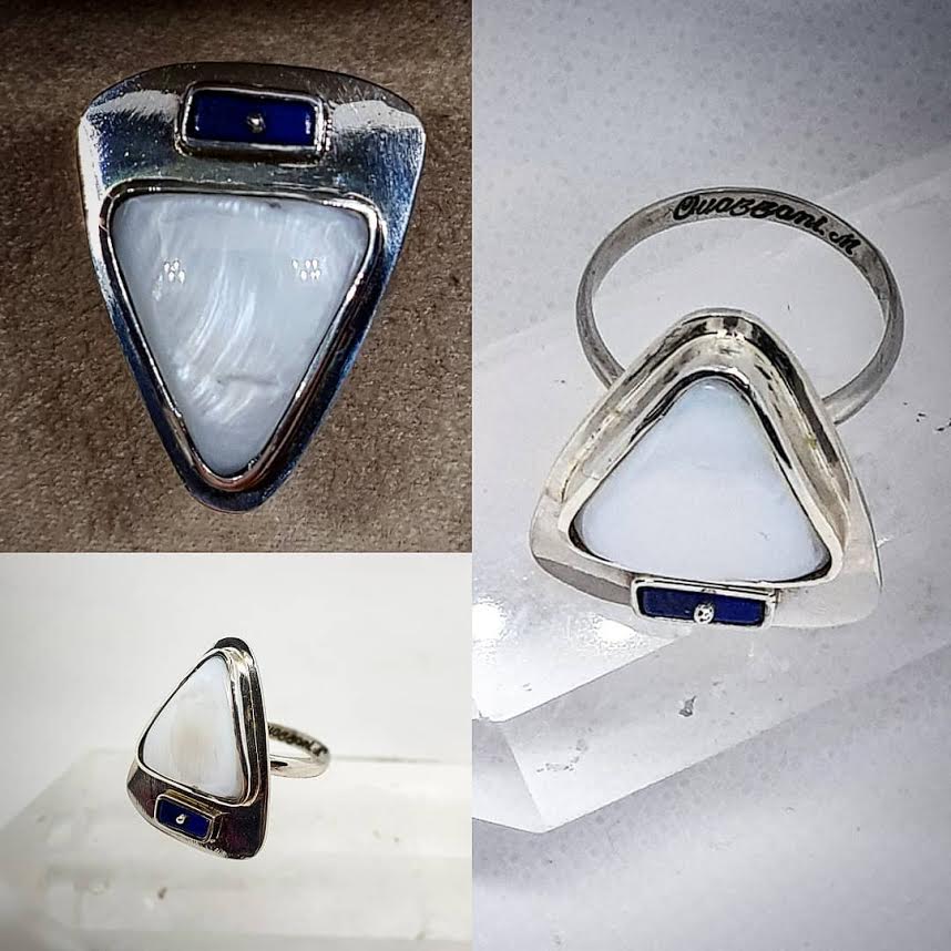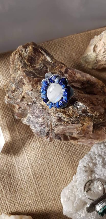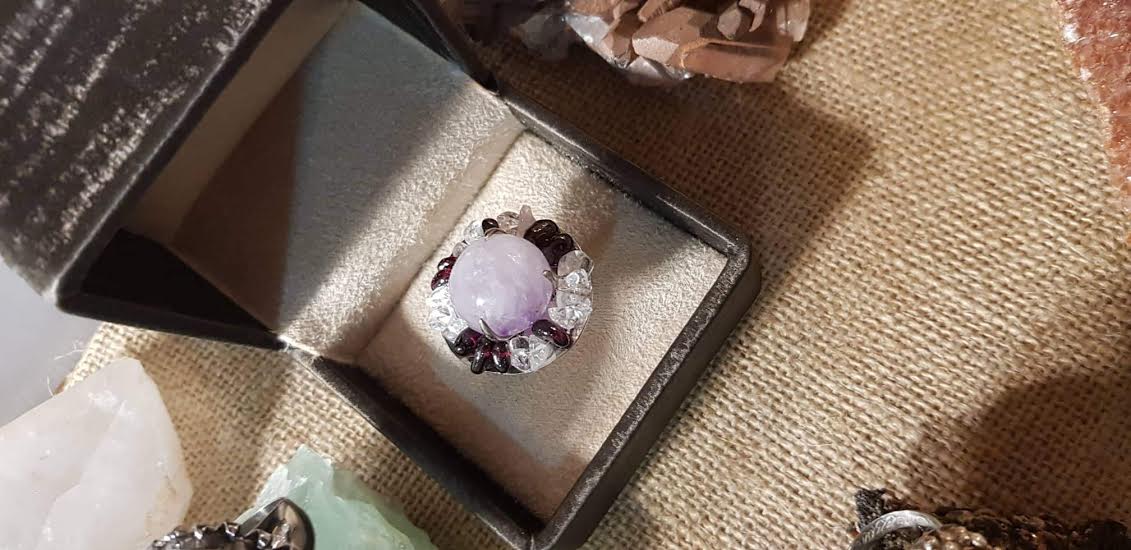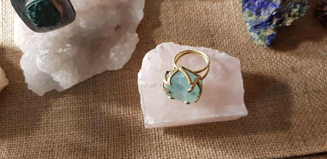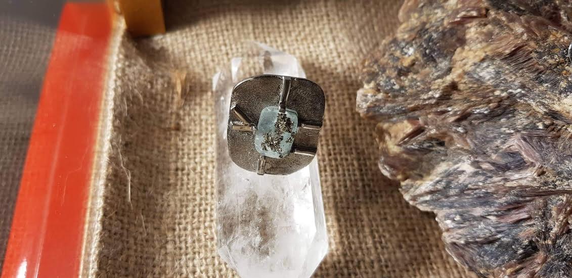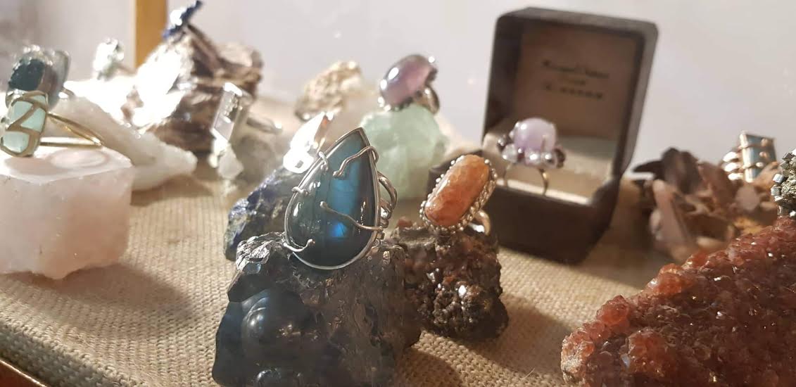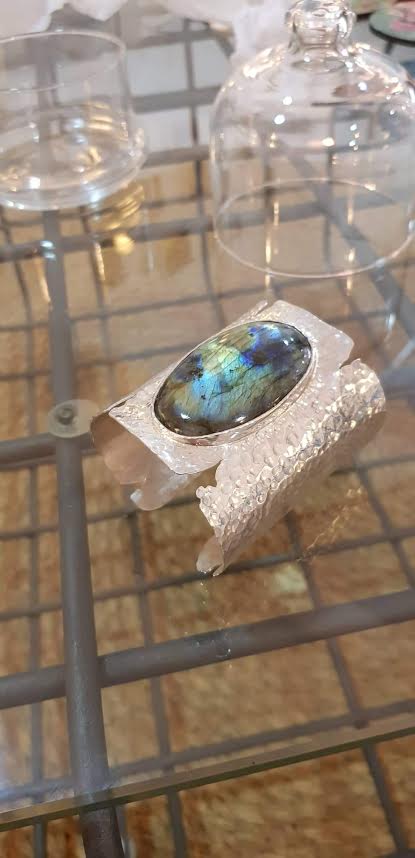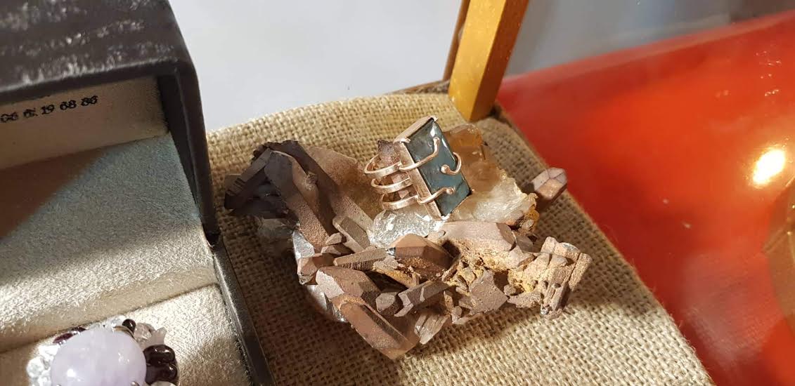 Labradorite au bleu intense, monocristal naturel de pyrite, labradorite sur argent 925 martelé rhodié or blanc,… Ce sont les bagues ornées d’une ou plusieurs pierres étincelantes présentées au Carré Créateur par Mohamed Ouazzani. Sa signature ? Eblouir les pierres qu’il a taillé en en les prélevant, souvent lui-même, de l’Atlas marocain. Mohamed Ouazzani a l’œil. Il a le don de découvrir des pépites et d’oser les manier afin de façonner des modèles singuliers. Pour l’heure, l’exposition-vente n’a pas de date de fin, comme nous le fait savoir l’artiste, ajoutant que tant que la magie opérera, elle continuera.
