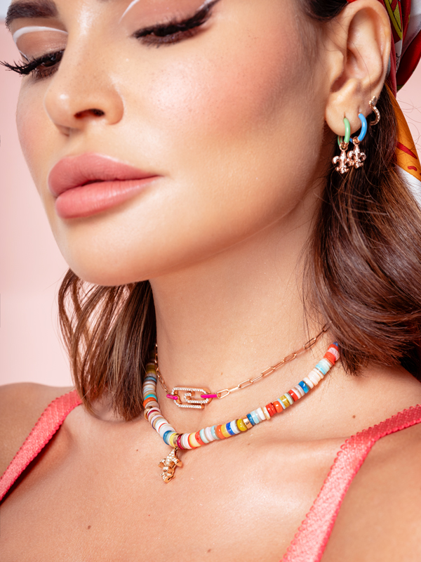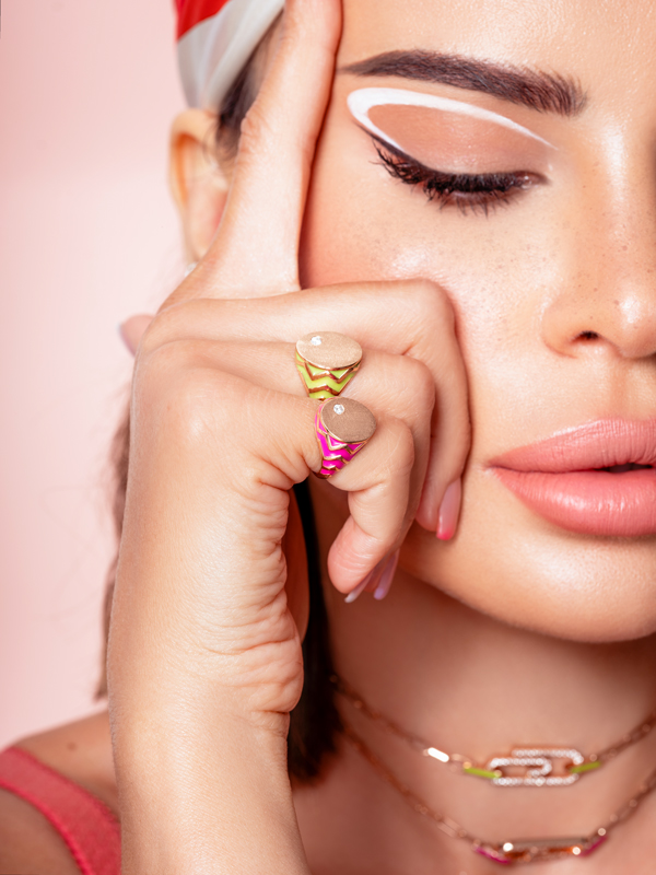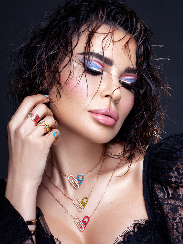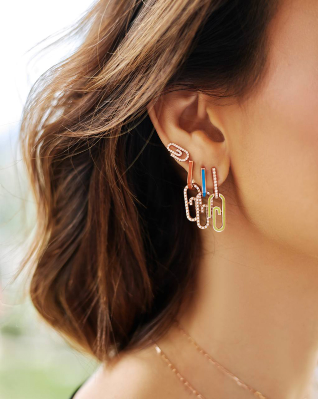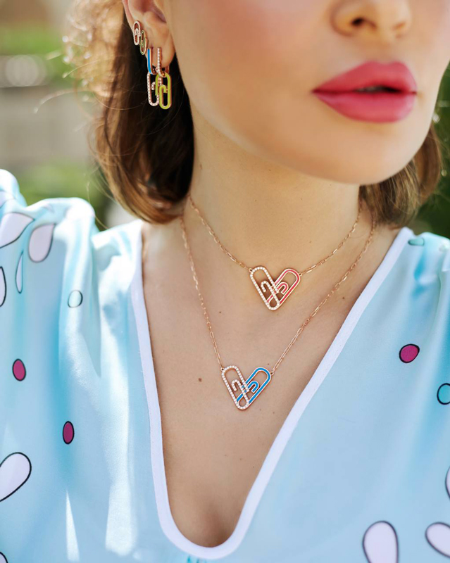 Heart Attach est un clin d’œil au motif du trombone combiné à la forme du cœur. Sertis de diamants de haute qualité, en or rose 18 carats et émail néon, les bijoux permettent de créer de superbes looks frais et élégants, selon ses envies et son humeur.