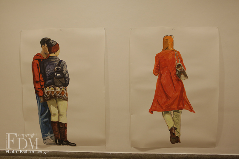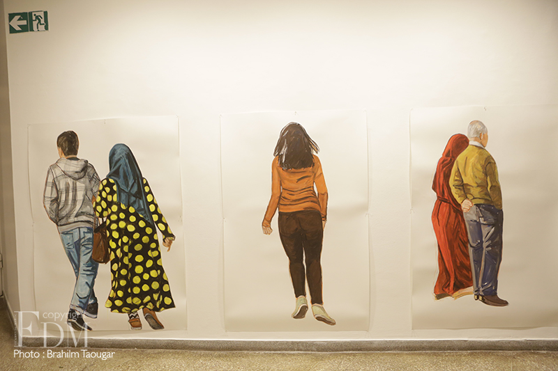 “Lorsque je m’immerge dans une ville que je découvre, pour en faire son portrait, j’ai besoin dans un premier temps de rester spectateur, observateur de ceux qui l’habitent et l’animent… J’ai choisi de dé-peindre Casablanca à travers une série de portraits (grandes gouaches,150cm/110cm) de femmes, les Bidaouyates”, explique Elvézir. L’artiste peintre qui a séjourné à Casablanca entre fin septembre et novembre dernier a immortalisé des silhouettes et des personnages. “Par cette démarche, j’essaie de montrer la multitude, l’image plurielle de ses habitants ; quel que soit leur âge, leur condition sociale, leurs habitudes vestimentaires, ces dernières mêlant souvent tradition et contemporanéité. Les personnes que je choisis de peindre, souvent de dos, sont des inconnus que je croise dans la rue. Des couleurs, des lumières ou des attitudes retiennent mon attention. Ces singularités m’apparaissent telles des personnages-symboles. Représentatifs de leur ville par leur diversité, leur point commun est d’habiter, de cohabiter tous au sein de la même cité, tout en restant des anonymes couchés sur une toile”, précise-t-il.