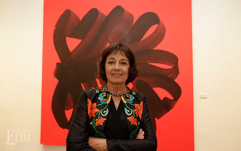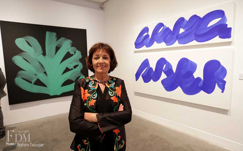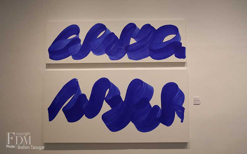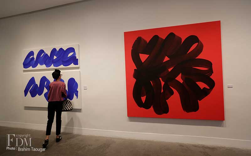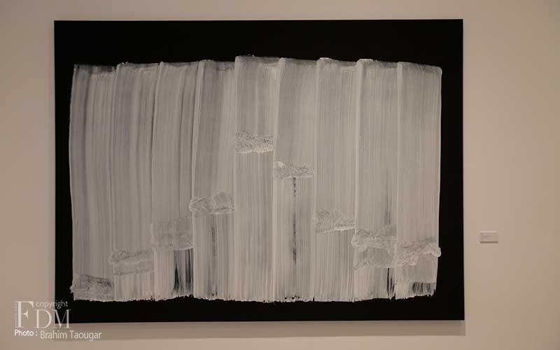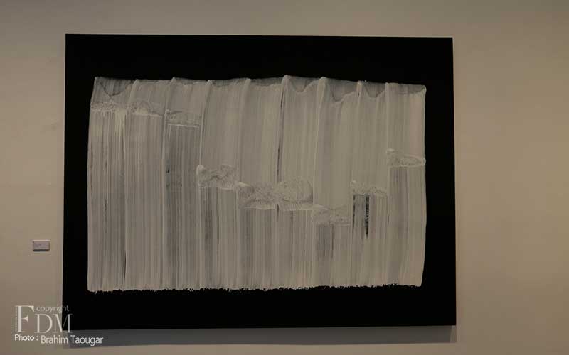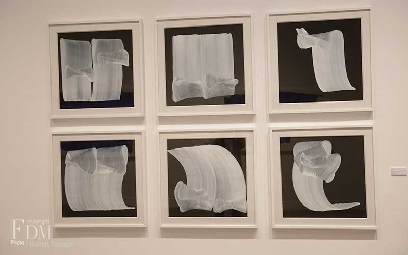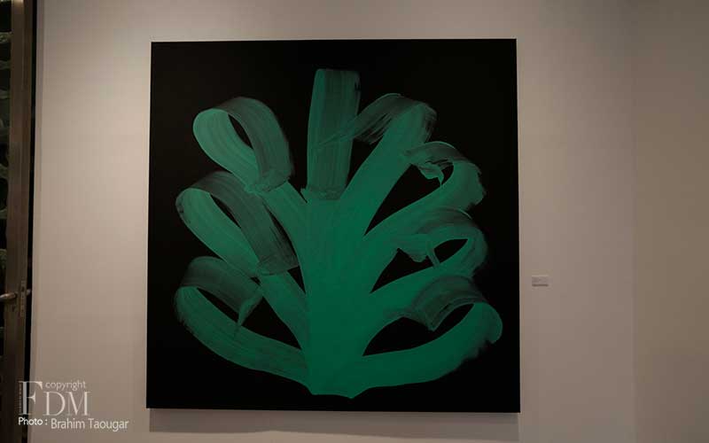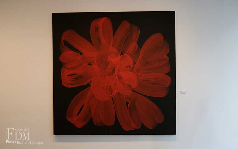 Pour sa deuxième exposition personnelle à la galerie d’art L’Atelier 21, Najia Mehadji évoque dans un florilège d’œuvres les différents gestes qui ponctuent son travail de peintre. Dans la série Vague, c’est le flux et le reflux présents dans la pensée soufie qui sont symbolisés pour exprimer un retour aux origines afin d’atteindre l’universel. La vague s’inscrit dans une ligne qui continue ce mouvement perpétuel. Dans la série Chute, l’artiste juxtapose des lignes verticales blanches qui font masse tels des « blocs de sensations » évoqués par Gilles Deleuze à propos des œuvres d’art. Le mouvement caractérise également les œuvres des séries Gnawa Soul et Touche : mouvements circulaires des confréries soufies reliés à la terre et au cosmos, mouvements de la danse et de l’exaltation des corps des gnawa. Dans la série Sea Flower, Mehadji établit une relation avec le motif floral qu’elle a utilisé durant une décennie au début des années 2000, ici ce ne sont pas des fleurs terrestres mais des fleurs des mers qui sont offertes à notre regard.