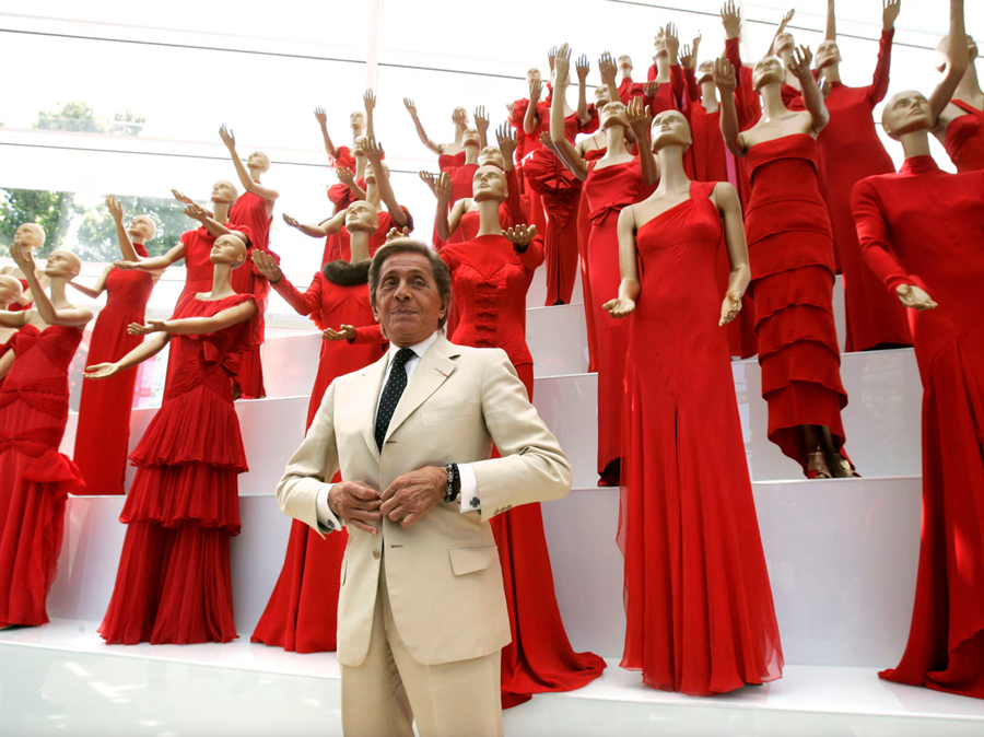 Probablement la signature la plus célèbre du couturier, le rouge Valentino est devenu un symbole visuel indissociable de son style. Inspiré d’une femme en robe rouge qu’il aperçut lors d’un opéra à Barcelone lorsqu’il était jeune, ce ton vibrant  souvent appelé Rosso Valentino  représente la passion, la féminité et la confiance. Valentino l’a décliné tout au long de sa carrière dans des robes de soirée, des manteaux et des ensembles couture, jusqu’à faire défiler toutes ses modèles en rouge pour sa dernière collection avant sa retraite.