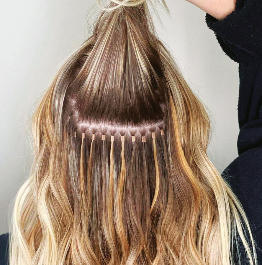 4. Extensions à la kératine : elles sont collées mèche par mèche au niveau des racines avec des gouttes de kératine, puis fixées à l’aide d’un fer à lisser. Elles offrent un résultat très naturel mais demandent un entretien rigoureux.
