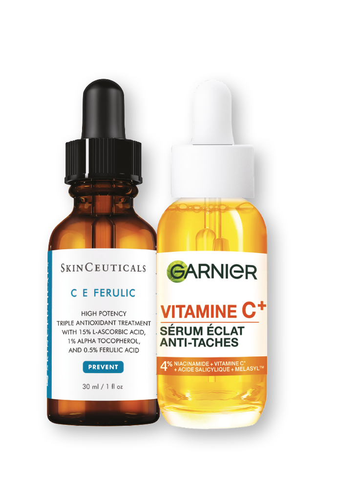 • La vitamine C, antioxydant puissant, limite la production de mélanine et ravive l’éclat du teint. Le sérum C E Ferulic de SkinCeuticals, riche en acide L-ascorbique pur à 15 %, fait office de référence en matière de soins à base de vitamine C. Sa texture légèrement huileuse pénètre profondément et agit sur les taches et la fermeté. Au cœur du Sérum Glow Energie [C+], l’action antioxydante de la Vitamine C est boostée, atteignant l’efficacité d’une dose 10 fois supérieure à celle la de Vitamine C seule, grâce au pouvoir unique à capter la lumière d’un actif breveté extrait de la Capucine Orange, pour uniformiser le teint et lui redonner son éclat. Le Vitamine C+ Sérum Eclat Anti-taches de Garnier, concentré en Vitamine C, est conçu pour une réduction multidimensionnelle de tous les types de taches, même les plus tenaces : intensité, densité, contraste.