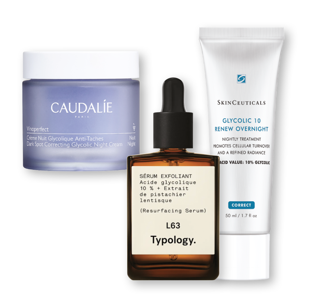 • Les acides exfoliants (AHA/BHA), comme l’acide glycolique ou lactique, stimulent le renouvellement cellulaire. Le Glycolic 10 Renew Overnight de SkinCeuticals agit la nuit pour affiner le grain de peau et atténuer les taches. La marque Typology propose le L63 – Sérum exfoliant Acide glycolique 10 % + Extrait de pistachier lentisque, bien toléré par la peau. La Crème Nuit Anti-Taches à la Viniférine & Acide Glycolique de la gamme Vinoperfect de Caudalie corrige les taches et agit comme un peeling doux pendant la nuit pour unifier le teint.