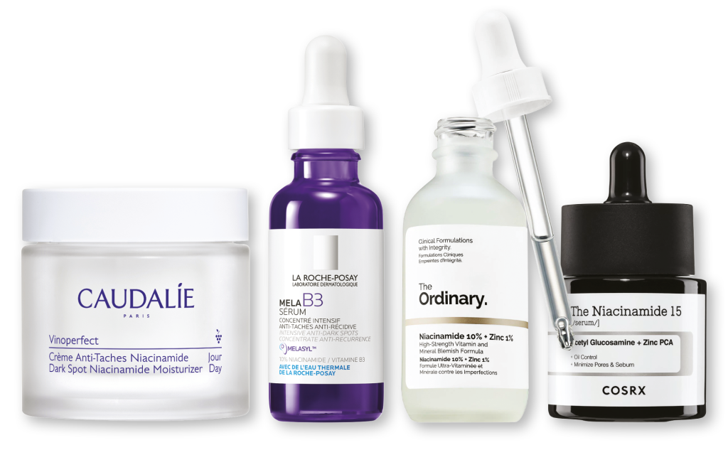• La niacinamide, alias vitamine B3, prisée pour son action douce mais redoutablement efficace contre les irrégularités. Le Niacinamide 10% + Zinc 1% de The Ordinary est une valeur sûre. On peut citer également The Niacinamide 15 Serum de COSRX, le Méla B3 Sérum de La Roche Posay, ou encore la Vinoperfect Crème Anti-Taches à la Viniférine & Niacinamide de Caudalie qui associe le pouvoir anti-taches de la viniférine à la niacinamide pour encore plus d’éclat.