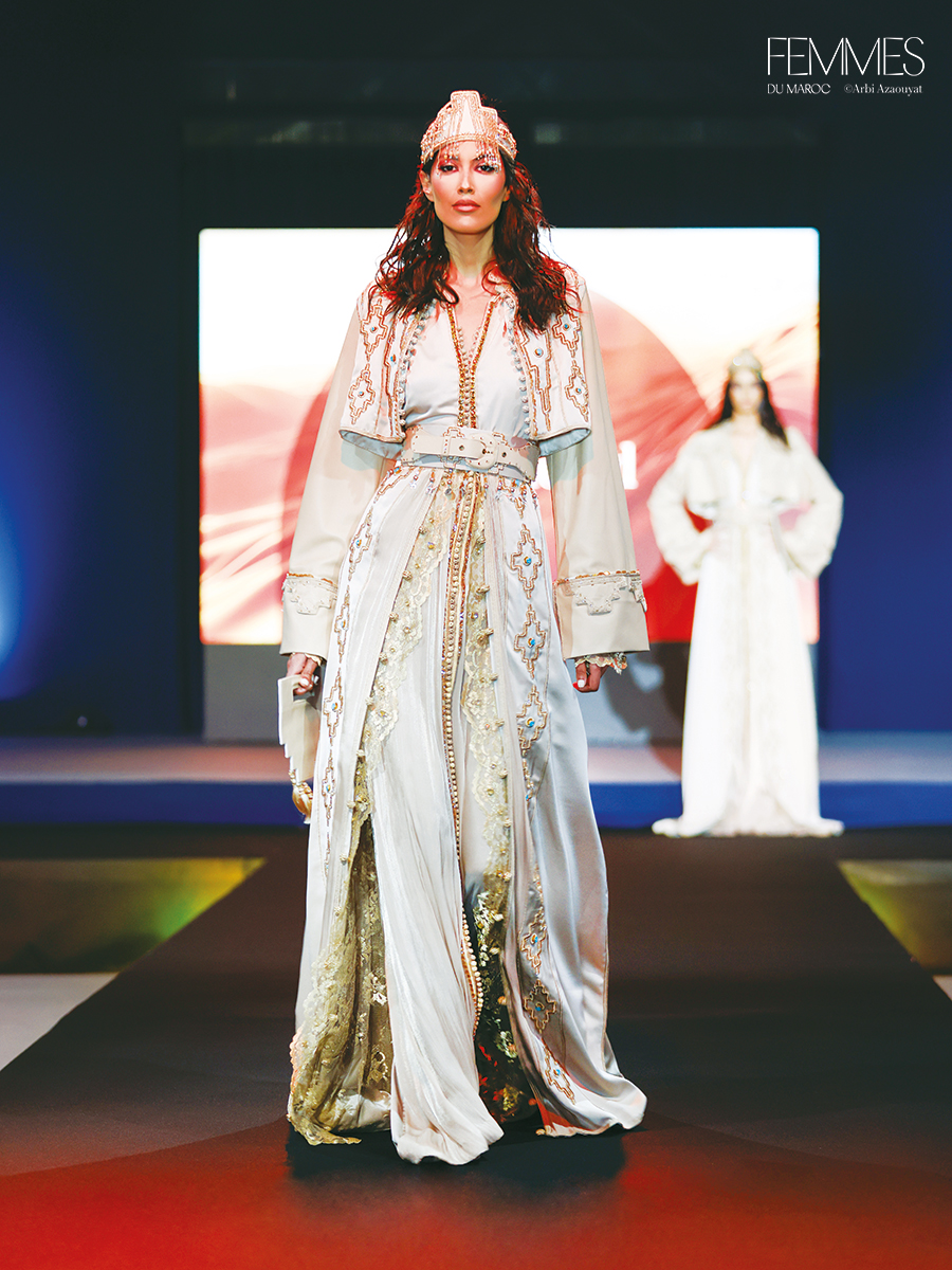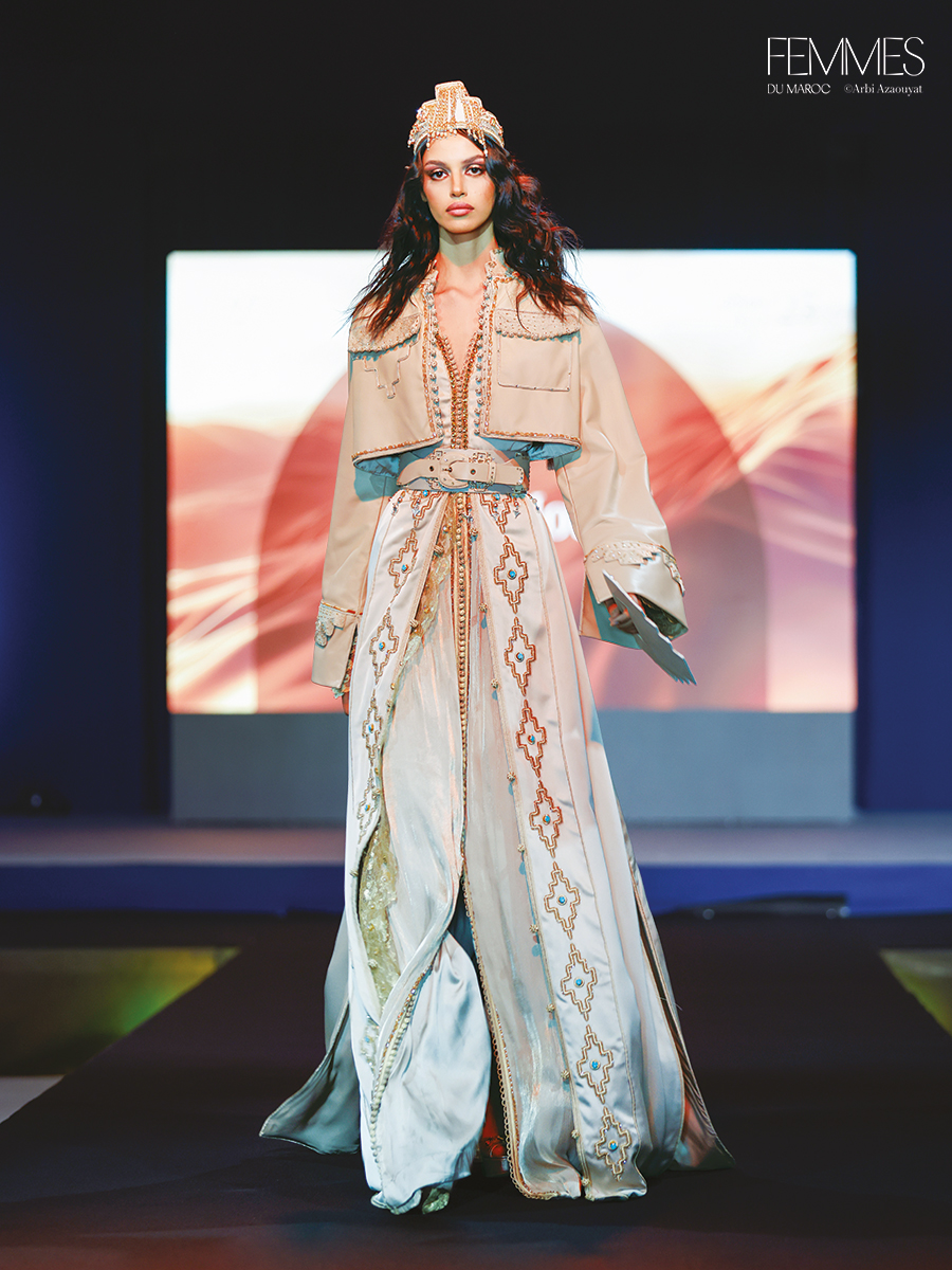 C’est dans cet esprit que Zineb a postulé au Défilé jeunes talents 2025. Sa collection, intitulée “Kasbat Amridil”, rend hommage à un symbole fort du sud marocain : la kasbah. “J’ai voulu que mes tenues évoquent la kasbah, que ses lignes, ses textures et ses ornements se reflètent dans mes caftans. Je me suis inspirée de l’architecture extérieure des kasbahs, notamment des motifs sculptés dans la terre, que j’ai retranscrits à travers des broderies et des détails visuels”, détaille-t-elle.