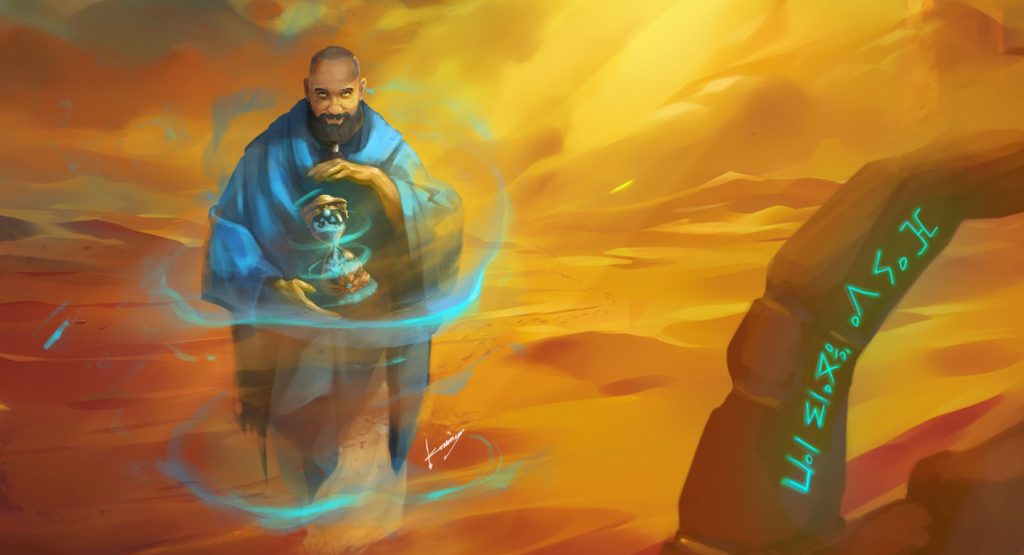 Le visuel principal met en scène Mr. ID dans un désert incandescent, marchant tel un voyageur initiatique, tenant un sablier-talisman.