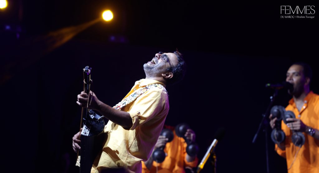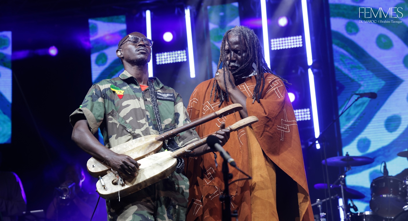 Sur la scène Moulay El Hassan, Hind Ennaira a captivé le public par sa maîtrise du guembri et son chant habité. Une des rares femmes à avoir osé revendiquer sa place dans cet univers longtemps réservé aux hommes, elle a livré un moment intense, à la fois ancré dans la tradition et résolument moderne. La soirée s’est poursuivie avec Maâlem Mohamed Boumazzoug, qui a entraîné le public dans une fusion joyeuse aux côtés de musiciens venus du Maroc, du Mali et de France. Le mélange de balafon, batterie, trompette et guembri a donné naissance à un set vibrant, à la croisée du jazz et de l’afrobeat.