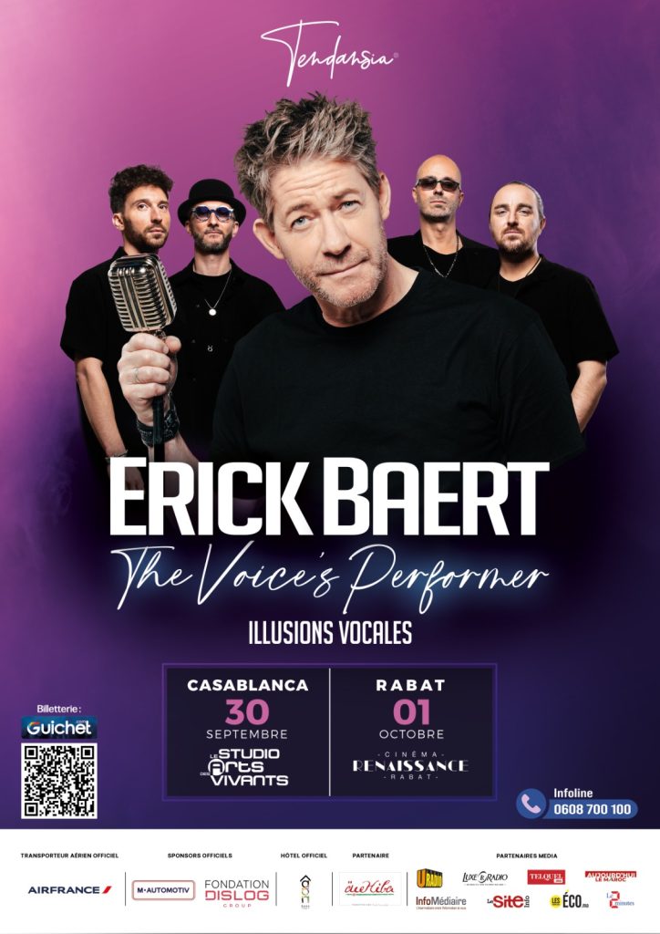 Après avoir marqué les esprits à Comediablanca, Erick Baert fait son grand retour au Maroc, soutenu par Tendansia qui orchestre cette nouvelle aventure. Entouré de ses musiciens live, l’artiste plonge le public dans un show de 1h30 où virtuosité vocale, humour et intensité musicale s’entrelacent pour offrir une expérience scénique totale.