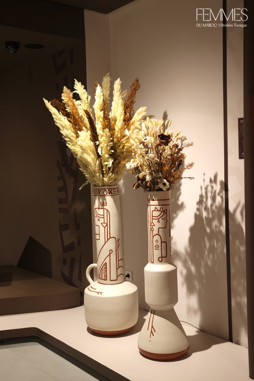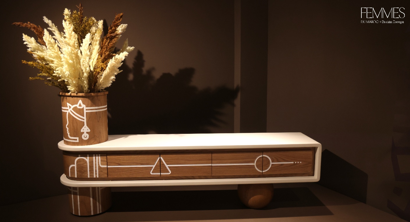 Formée en arts appliqués à l’Institut National des Beaux‑Arts de Tétouan, Marya Belkhou a forgé un langage où l’illustration quitte le papier pour entrer dans la matière. Ses lignes s’adaptent aux volumes et épousent vases, meubles et parois, transformant l’objet en support narratif. Sa collection « Sous les rêves du baobab » rend hommage aux femmes africaines et marocaines, gardiennes de récits et de mémoire. Par des formes géométriques et des motifs contemporains, ses créations proposent un design au féminin ancré dans la culture et tourné vers l’avenir.