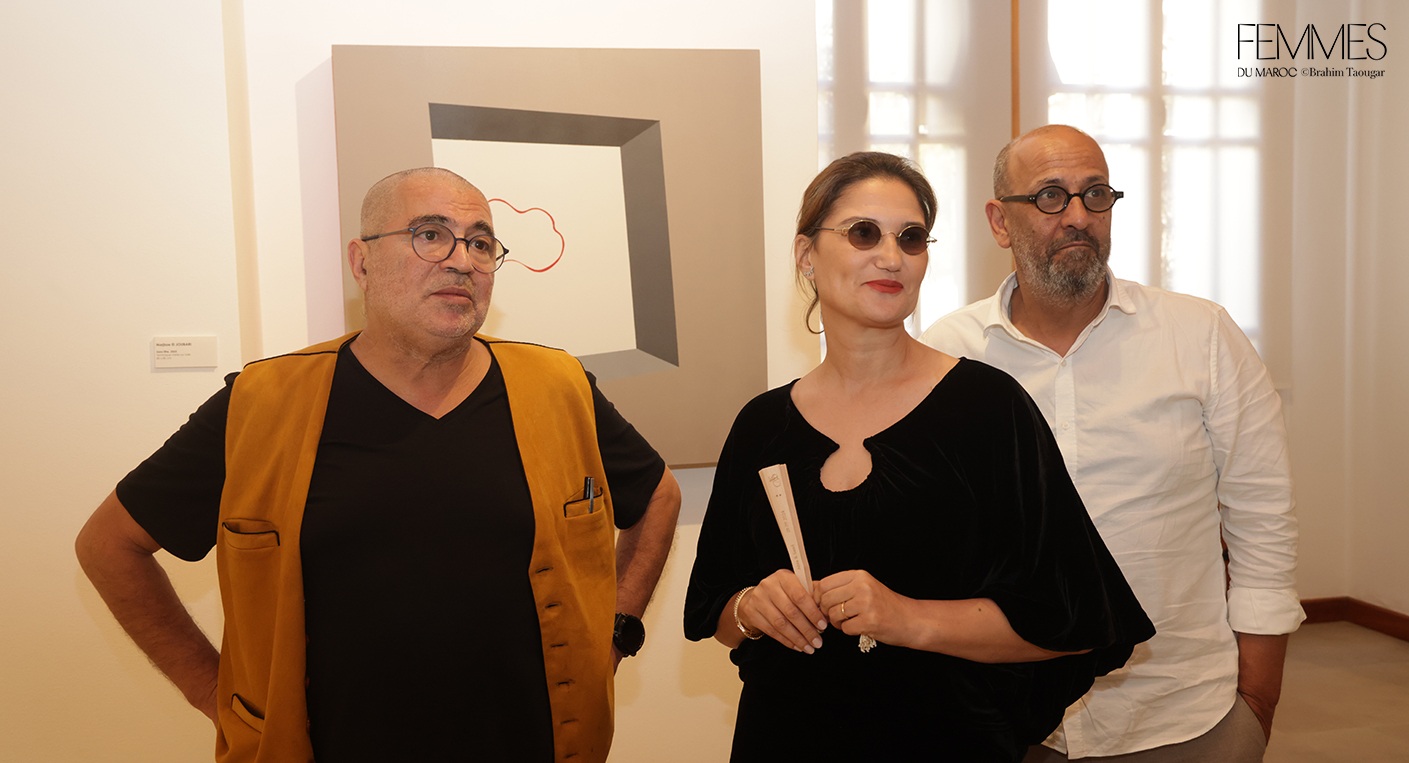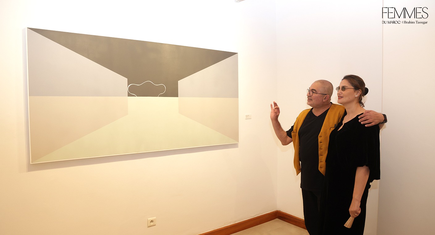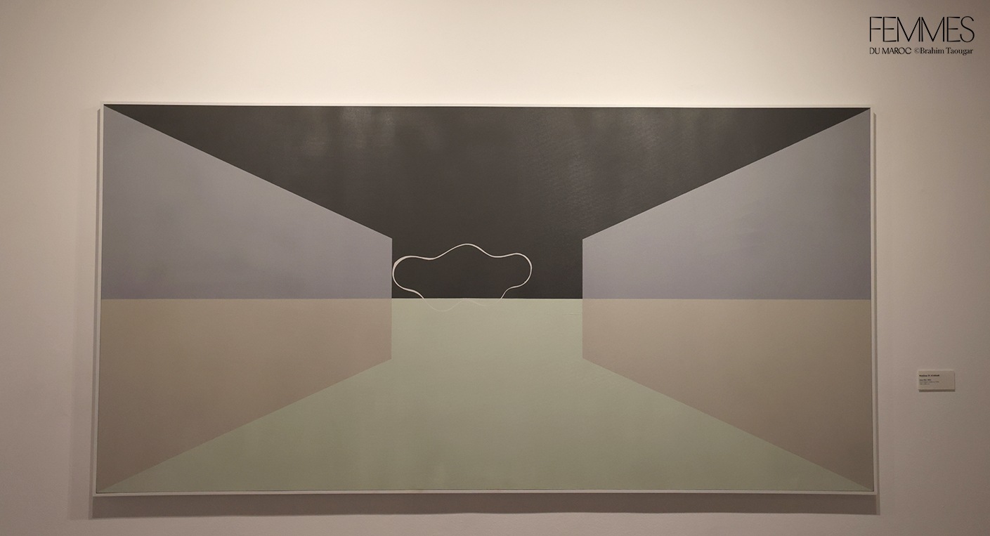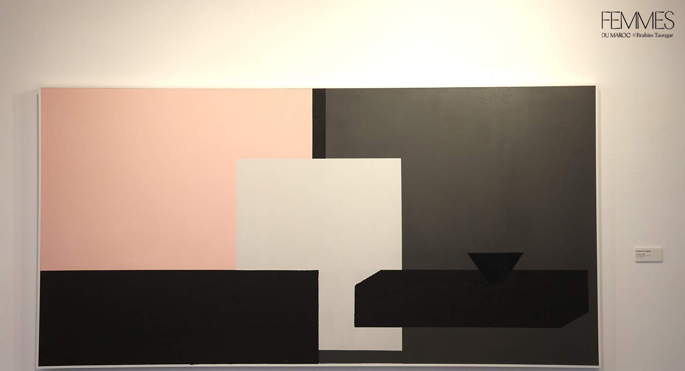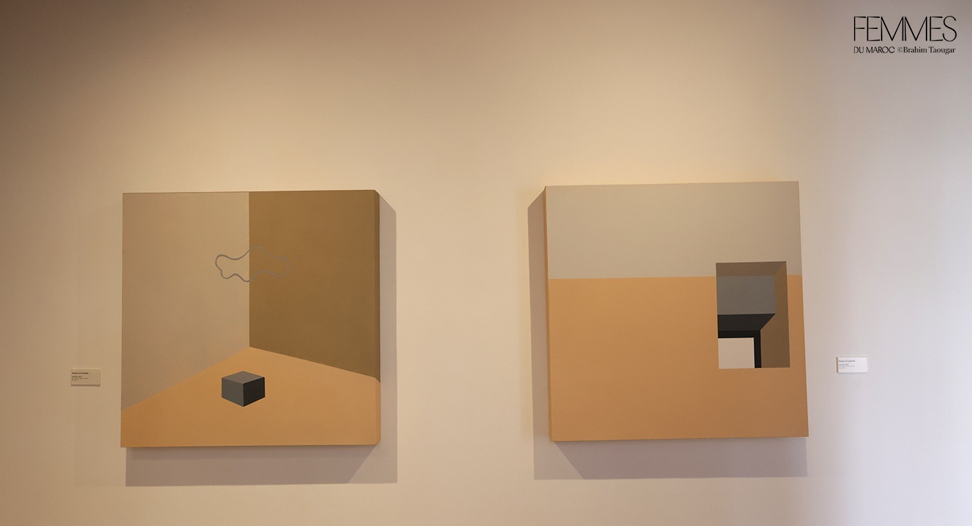 Cette fois ci, « Narjisse ose le geste géométrique et caresse les volumes, dans un jeu d’ombre et de lumière ». « L’essence de l’art est dans la géométrie » affirme l’architecte et peintre Nadir Afonso. C’est sans doute cette essence même que tente de captiver El Joubari dans son œuvre récente, en humanisant les formes qu’elle dessine. Dans une certaine poésie, l’artiste fait allusion à ce qu’elle observe, sans pour autant être explicite. Elle suggère une certaine idée des volumes pour retracer sa vision du monde. Guidée par une intuition, l’artiste nous donne à contempler quelque chose de mystérieux. « Les volumes flottent et nous invitent au voyage. » précise Selma Naguib, curatrice de l’exposition.« Le ciel, changeant, selon les heures et les saisons, mais encore les murs… Chaulés, puis recouvert de ces fresques du Moussem d’Assilah que l’artiste Narjisse El Joubari apprendra à contempler et à observer et comment, la pluie peu à peu va les délaver, ou le soleil les craqueler… Et toutes ces variétés de nuages qui s’irisent, qui ombragent puis qui inondent l’air d’autant de gouttelettes irradiant les airs d’une infinité de teintes lumineuses avant de s’écraser sur les remparts… Rien dans la vie n’est pérenne ni constant, comme ces nuages tant prisés de l’artiste qui ne sont jamais tout à fait noir ni tout à fait blanc mais de cette infinité de nuances de gris qui mènent de l’un à l’autre…