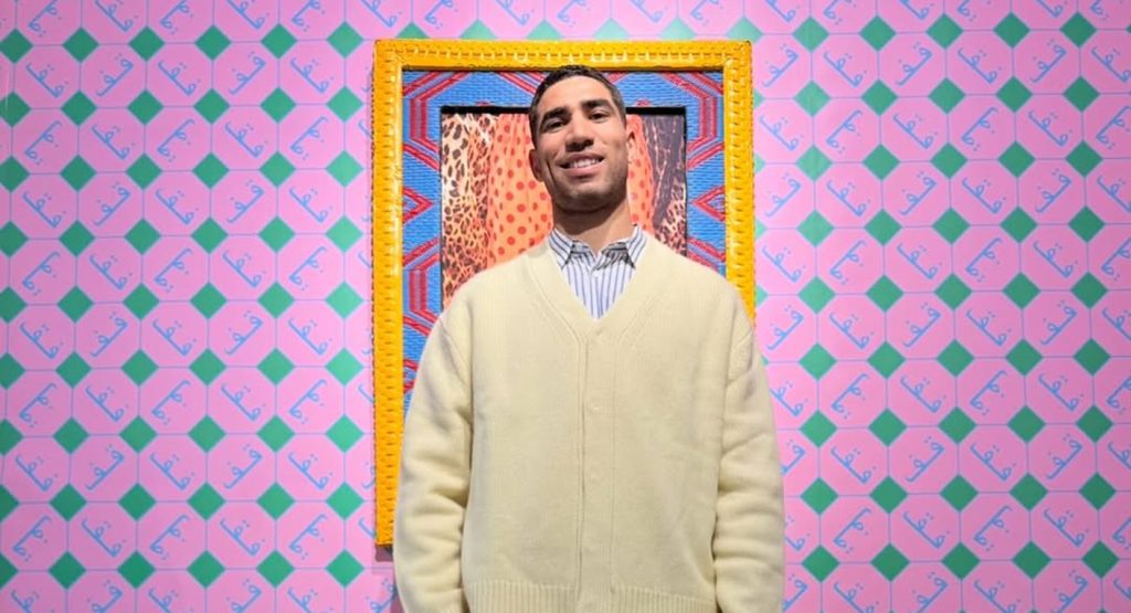 Devant l’objectif pop et coloré de Hajjaj, connu pour son esthétique inspirée du pop art et de l’univers urbain, Hakimi adopte une posture fière et décontractée. Entouré de motifs vifs, d’emballages détournés et de décors typiques, le joueur devient plus qu’un athlète : il se fait symbole d’une jeunesse marocaine confiante, moderne, mais profondément ancrée dans ses racines. Hajjaj, en maître de l’image, réussit à fondre le charisme sportif de Hakimi dans un univers visuel flamboyant, où la tradition rencontre le contemporain avec audace. Une collaboration de plus qui marque les esprits a l’instar de Will Smith mais aussi Madonna et bien d’autres artistes qui sont passés par l’objectif pop de Hassan Hajjaj.