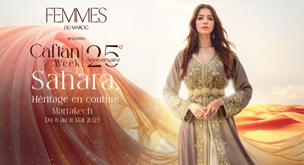 Pour son 25ème anniversaire, Caftan Week promet une édition unique sous le thème : “Sahara, héritage en couture”. Un hommage à un territoire riche en traditions, où chaque création racontera l’âme du désert. Dunes dorées, oasis secrètes, ciels étoilés… Autant d’inspirations pour les designers qui feront briller le patrimoine marocain à travers leurs pièces uniques.