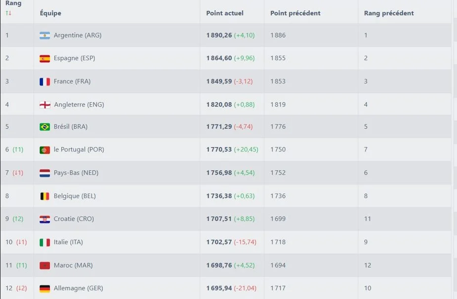 Cette montée s’explique aussi par la baisse de régime de certaines équipes concurrentes. L’Allemagne, jusqu’ici 10ᵉ, devrait perdre quelques places après des défaites récentes, tandis que l’Italie pourrait récupérer le Top 10. La Croatie, solide 9ᵉ, consolide sa position grâce à ses larges victoires en qualifications pour la Coupe du Monde 2026.