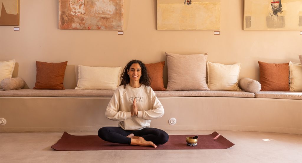 J’ai créé Slow Casablanca parce que j’ai rêvé d’un lieu qui serait ambassadeur de la Slow Life au milieu du rythme effréné de la vie casablancaise. Slow est un lieu hybride où l’on peut à la fois pratiquer du Yoga ou de la boxe, boire un café, bouquiner ou télétravailler, contempler des oeuvres d’art de jeunes talents ou assister à des ateliers de tous genres : manuels (tricot, crochet, broderie, peinture sur céramique…), de développement personnel et de santé mentale (cercles de parole, cercles d’écriture, talks sur l’hypersensibilité, sur le burnout…), des ateliers d’improvisation théâtrale, … Nous proposons également des activités pour les ados ou des ateliers parent-ado. Mon intérêt pour la Slow Life est né il y a une dizaine d’années quand je me suis lancée dans l’entrepreneuriat en lançant AMAZ, une marque Slow Fashion de baskets marocaines éthiques, que j’ai dû malheureusement arrêter pendant la crise du Covid. La Slow Life est un mode de vie qui a beaucoup résonné en moi, moi qui avais jusque-là toujours vécu sous un modèle de course à la performance et à la productivité tout en ressentant au plus profond de moi que ce modèle ne me correspondait pas. La Slow Life est une philosophie de vie qui encourage à ralentir le rythme, à vivre de façon plus consciente et à consommer moins mais mieux. Elle s’oppose à la culture de la vitesse, de la productivité excessive et de la surconsommation. J’ai d’ailleurs retrouvé ces mêmes principes de sobriété heureuse dans la philosophie du Yoga que je pratique depuis plus de 15 ans et que je transmets dans mes cours aujourd’hui en tant que Professeur de Hatha Yoga chez Slow.