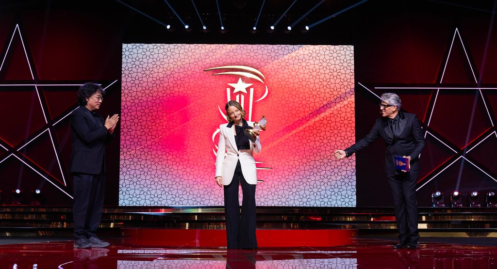 Lorsque Jodie Foster prend la parole, la salle retient son souffle. Elle dit son émotion d’être honorée « dans la même salle que le maestro, le brillant réalisateur Bong », vers qui elle se tourne avec affection. « Vos films continuent de nous toucher en plein cœur, de nous bousculer, de nous transformer », affirme-t-elle. En découvrant les extraits retraçant ses six décennies de carrière, elle confie avoir ressenti à la fois la longueur du chemin parcouru… et la vitesse à laquelle il est passé. « Je suis toujours là, un peu plus âgée, peut-être un peu plus froissée, mais animée par le même amour : raconter des histoires », dit-elle avec humour et sincérité. Elle rappelle ensuite ce qui la lie profondément au cinéma. « Comme vous, j’adore cet art. C’est le lieu où l’on se tient la main, côte à côte, dans le noir. Merci à vous, mes amis du cinéma », poursuit-elle.