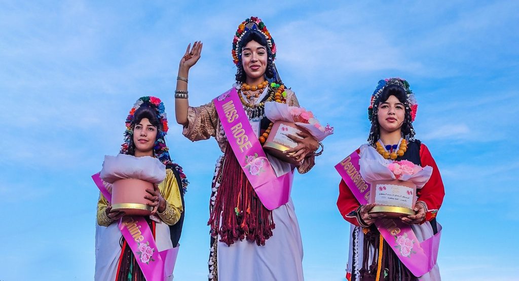 Entourée par ses deux dauphines, Hafida Amekhchoune et Fatima Dardar, Miss Rose 2025, originaire de Kelâat M’Gouna, a pu convaincre le jury qui évalue les candidates en se basant sur des critères de beauté, de compétences communicatives, de culture générale et de maîtrise de techniques de culture, de cueillette et de distillation de la rose à parfum.