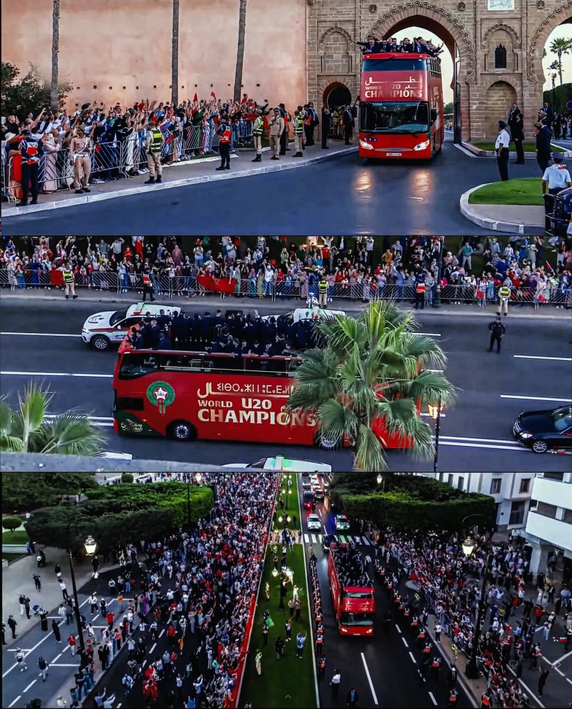 Souriants et visiblement émus, les joueurs et le sélectionneur Mohammed Ouahbi ont salué la ferveur populaire tout au long du parcours. Leurs supporters, drapeaux à la main, ont chanté et dansé pour exprimer leur fierté, quelques jours seulement après la victoire éclatante (2-0) face à l’Argentine en finale.