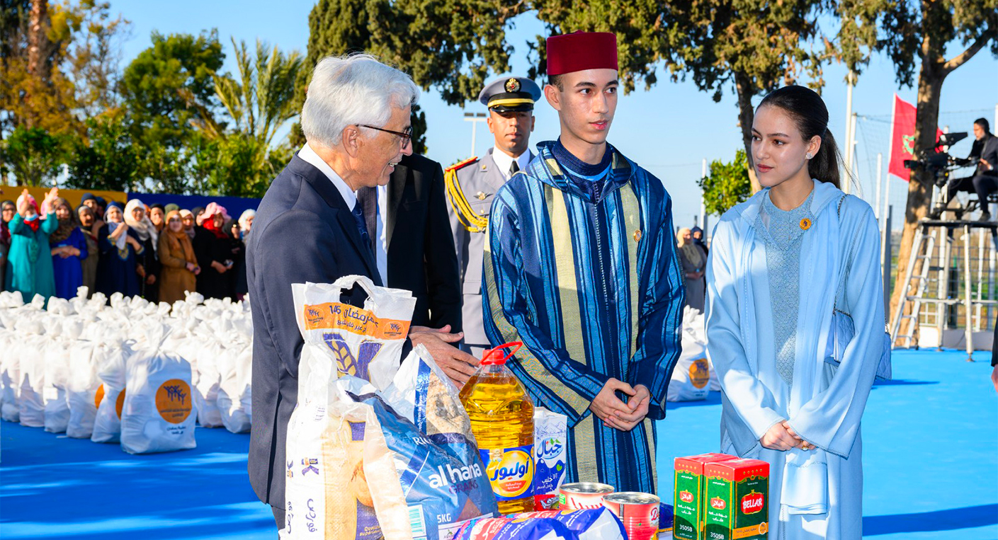 A cette occasion, SAR le Prince Héritier Moulay El Hassan et SAR la Princesse Lalla Khadija ont remis, à titre symbolique, des paniers de denrées alimentaires à 20 chefs ou représentants de familles bénéficiaires de l’opération “Ramadan 1446”, avant de poser pour une photo-souvenir avec des bénévoles qui participent à cette opération solidaire.