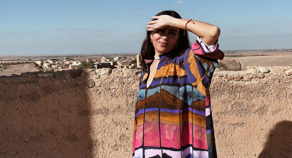 L’histoire de Rock The Kasbah Creation commence à Oumnass, petit village à 25 km de Marrakech, au cœur de la kasbah familiale. « C’est un lieu chargé d’histoire, d’architecture, de couleurs et de vie. En grandissant là-bas, j’ai toujours vu les femmes de ma famille et du village porter des kaftans magnifiques, des couleurs fortes, des tissus qui racontaient quelque chose. C’est là que tout a commencé pour moi : l’œil pour les détails, l’amour des matières et cette envie de créer des pièces à la fois authentiques, modernes et faciles à porter », raconte la créatrice. La marque, lancée en janvier 2025, est née d’une reconversion audacieuse. Après des études en tourisme puis un master en marketing, la jeune femme a été salariée pendant quelques années avant de suivre sa passion pour la mode. « Les matières et la création ont toujours fait partie de ce que j’aime. À un moment, c’est devenu évident de suivre cette direction et de construire quelque chose qui corresponde vraiment à ma manière de voir les choses », confie-t-elle.
