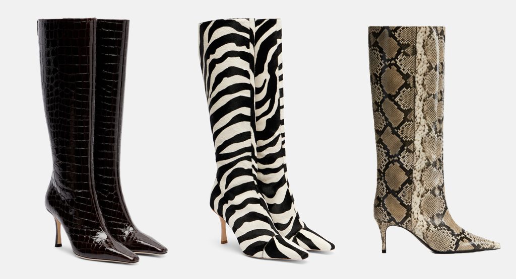 L’imprimé python reste un incontournable pour celles qui aiment attirer les regards avec subtilité. En version cuir verni ou mat, il apporte une touche d’exotisme et de raffinement. Portées avec un jean brut ou une robe fluide, ces bottes deviennent le point focal du look, oscillant entre élégance sauvage et allure couture.