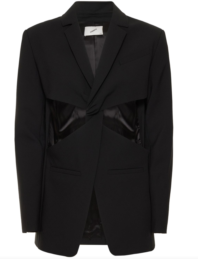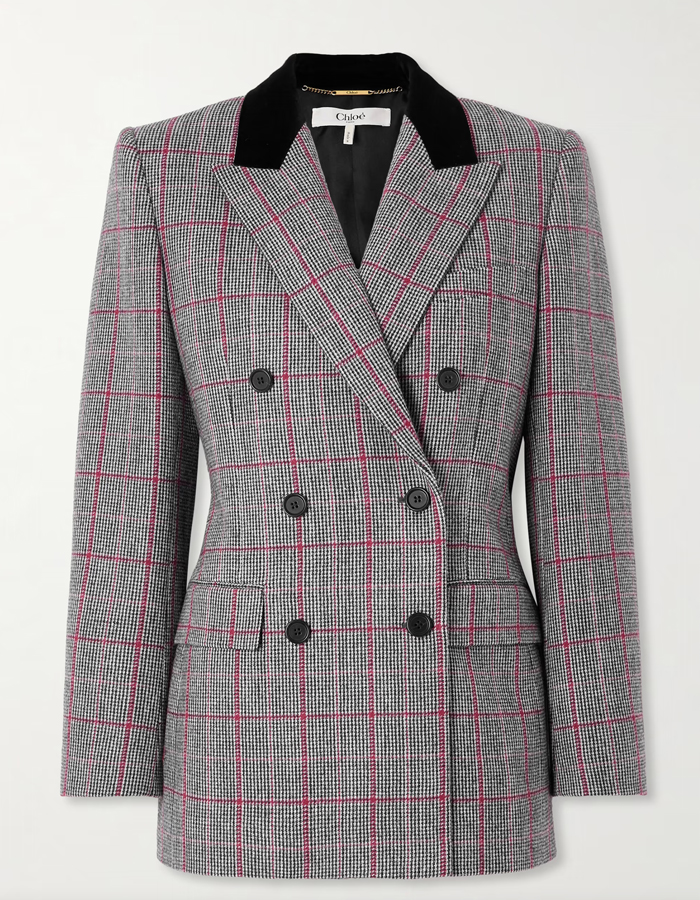 Blazer à double boutonnage en laine à carreaux et à finitions en velours