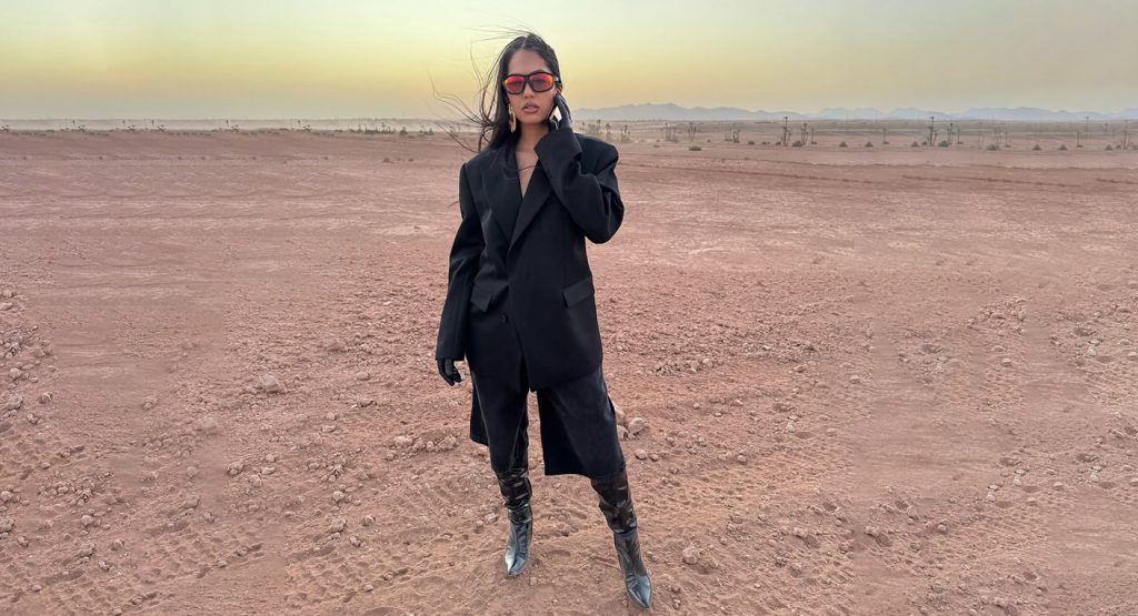 Veste de tailleur oversize signée Issey Miyake, structurée à la perfection, elle incarne à la fois puissance et élégance.Bermuda noir façon city short de chez Jacquemus, qui casse les codes en ajoutant une touche urbaine maîtrisée.Bottes pointues à talons vernis modèle Stiletto de chez Paris Texas, qui allongent la silhouette et renforcent l’attitude “badass”. Côté accessoires : grosses boucles d’oreilles dorées, lunettes oversize façon Balenciaga, et gants en cuir noir signés Brunello Cucinelli. Un mélange d’agressivité et de sophistication qui capte immédiatement le regard.