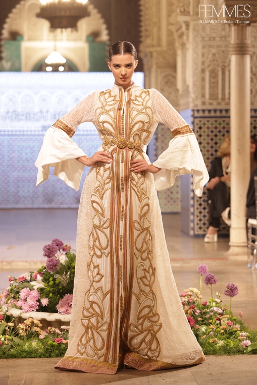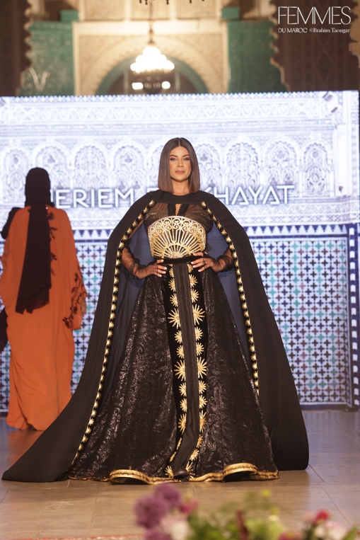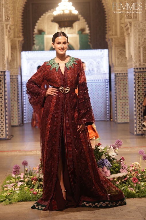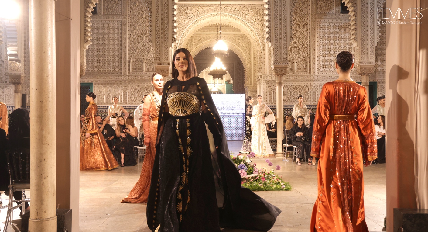 Leila Hadioui, véritable muse et figure iconique de la mode marocaine, a ouvert le bal dans une silhouette somptueuse, donnant le ton d’un défilé empreint de poésie et d’excellence artisanale. “Murmures” est tout sauf silencieuse. La collection résonne par la richesse de ses matières : brocard luxueux, soies précieuses, organza aérien, Georgette fluide… chaque tissu semble dialoguer avec l’histoire, sublimé par des broderies anciennes finement réinterprétées. Des pièces spectaculaires étaient également ornées de pierres précieuses, apportant éclat à des coupes toujours raffinées et modernes.Les silhouettes colorées, signature de Meryem Belkhayat, ont illuminé le décor arabo-andalou de Mahkamat Al Bacha. À travers cette collection, la créatrice célèbre non seulement ses années de passion et d’audace, mais aussi l’essence même du caftan marocain qu’elle ne cesse de réinventer avec grâce. “Murmures“ est un hommage. Celui d’une femme à son pays, à son art, et à toutes celles qu’elle habille depuis 18 ans. Un murmure, oui, mais qui résonne fort dans le monde de la mode marocaine et du Caftan.
