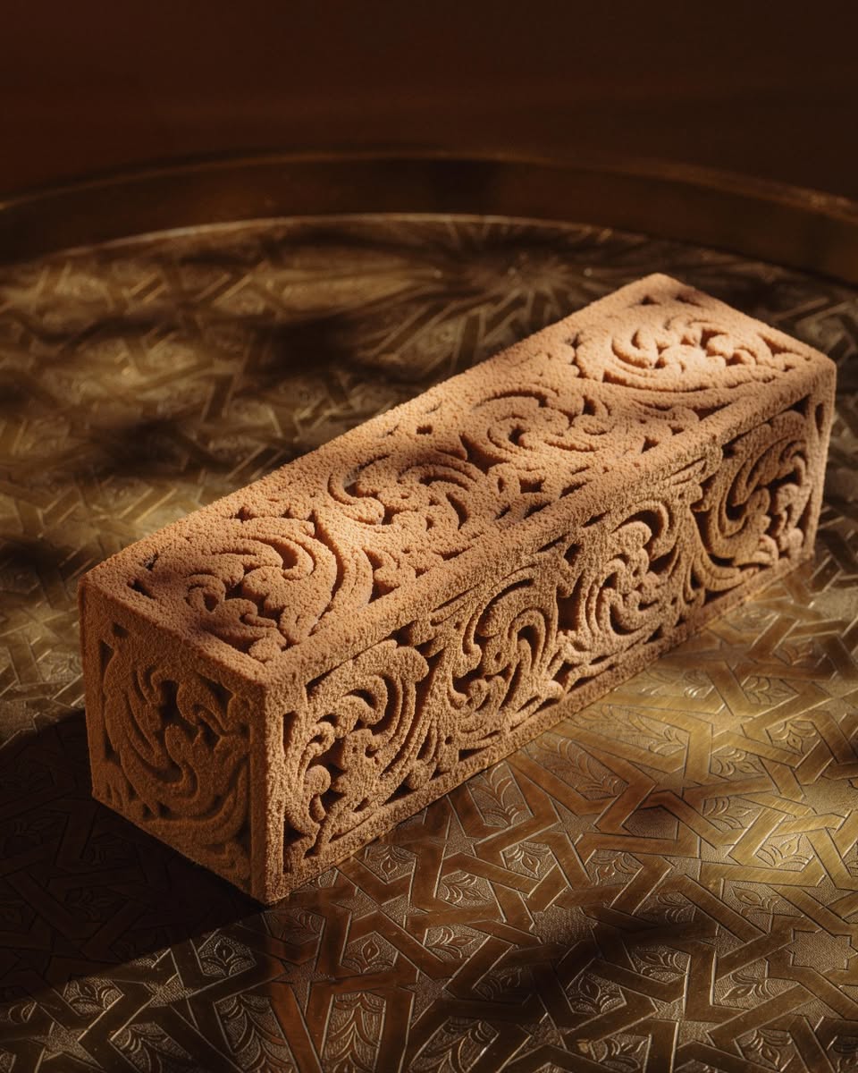 Ce délice combine un biscuit moelleux aux dattes avec une touche croustillante, un cœur onctueux à la datte Majhool et un insert fondant aux dattes et une mousse au chocolat blanc subtilement parfumée à l’orange. Son design s’inspire de l’art floral almoravide, avec palmes stylisées et motifs botaniques rappelant la Koubba almoravide, symbole d’élégance et de savoir-faire artisanal.