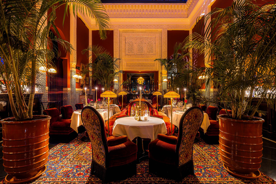 Dans l’assiette, le chef s’est amusé à plonger dans le savoir-faire français, s’imprégnant des codes de la Belle Époque. Il les a interprétés en les associant à l’opulence des produits marocains. Les crevettes de Oualidia, réputées pour leur qualité tout comme les huîtres de cette région, sont ainsi flambées au cognac et servies avec une sauce au poivre et des frites. Quant aux cœurs de laitue, que le chef propose habituellement avec une vinaigrette à l’huile de noisette, ils sont ici assaisonnés à l’huile d’argan, rappelant le terroir local.