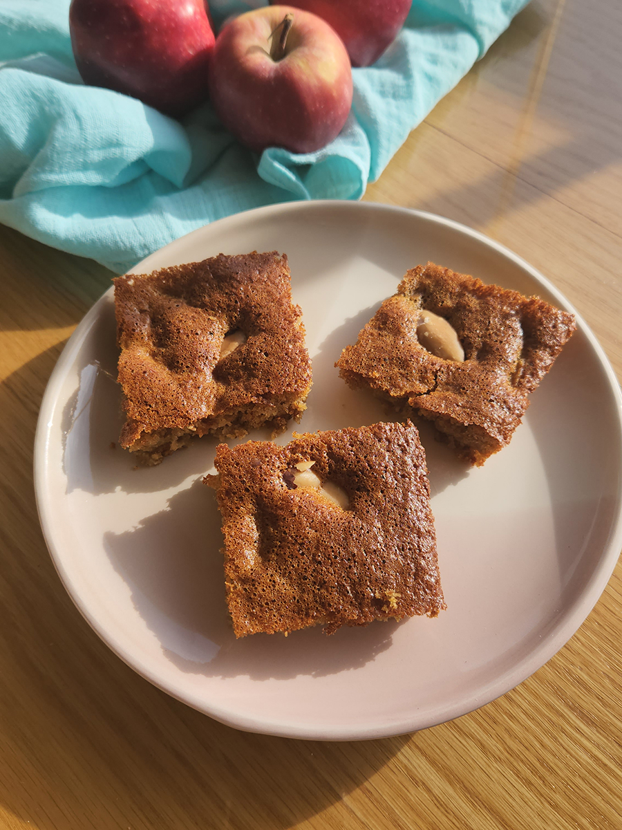 Ajoutez la poudre d’amande, la farine de sarrasin, ainsi que la poudre à lever et mélanger avec une spatule délicatement. Incorporez les pommes légèrement caramélisées.