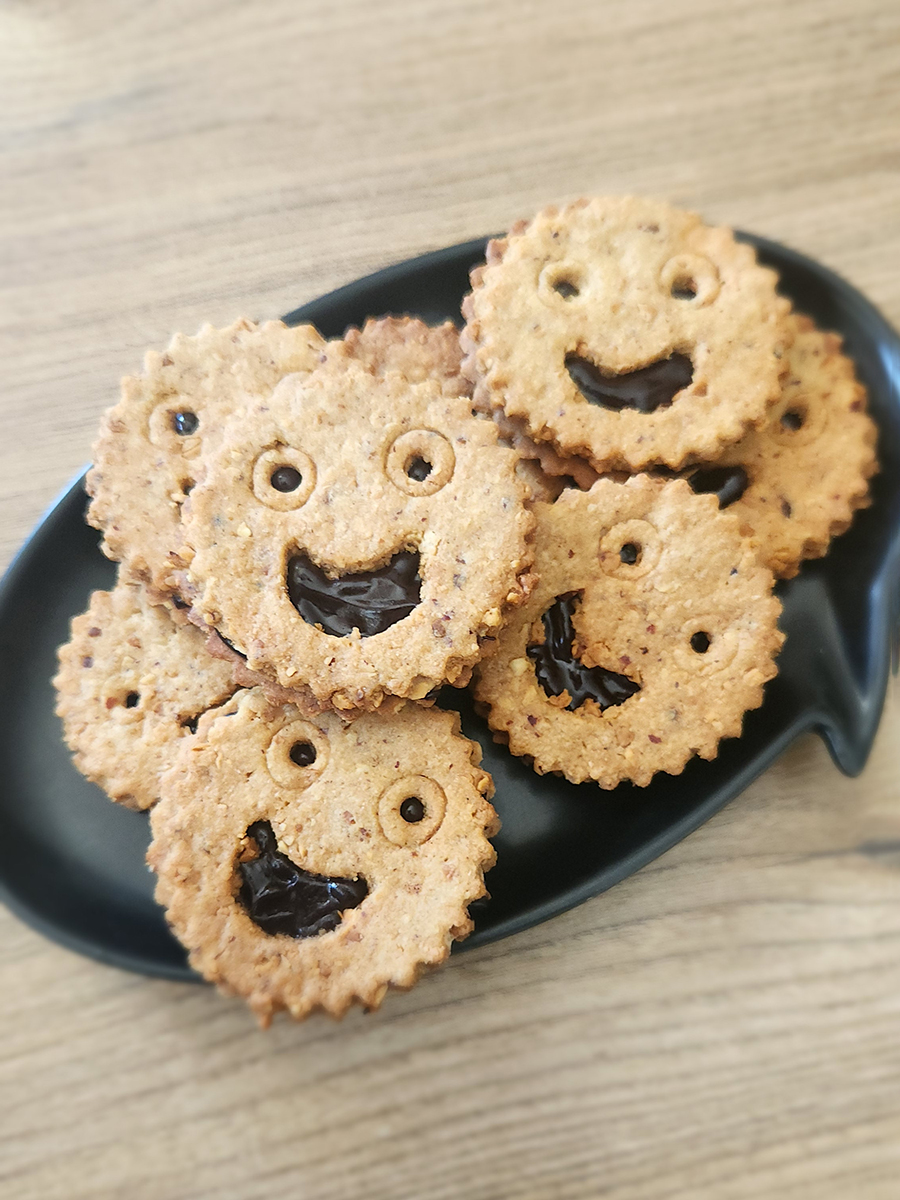 Laissez reposer 10 minutes, puis la travailler avec un rouleau de pâtisserie pour aplatir la pâte, puis utiliser un emporte-pièce en forme de smiley et si vous n’en avez pas, utilisez juste une paille pour former les yeux et travailler la bouche avec un couteau.