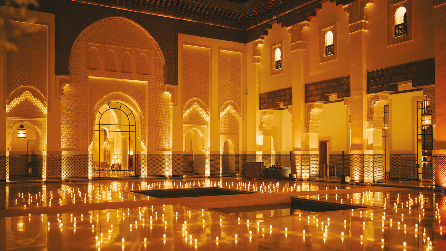 Avec son style architectural traditionnel maroco-andalou, caractéristiques des grands palais de la dynastie des Mérinides du 14ème siècle, The Oberoi Marrakech puise son inspiration de la Medersa Ben Youssef, l’un des plus célèbres monuments historiques de Marrakech. Dès l’entrée, le ton est donné : une cour centrale où trône un immense bassin noir donnant l‘illusion d’une profondeur infinie. Sur son miroir d’eau, une grande flamme centrale surgit miraculeusement à la tombée de la nuit pour donner un aspect enchanteur au lieu. Puis le bâtiment principal aménagé géométriquement autour d’une cour à ciel ouvert, dotée elle aussi d’un bassin qui reflète les rayons du soleil ou les lueurs de la lune. On découvre ensuite les magnifiques coupoles et arcades de bois sculpté à la main, les murs entiers de zellige aux couleurs vives et aux motifs géométriques complexes, ainsi que les grands panneaux de plâtre ciselé, arborant des vœux tels que “El afia el bakia”, signifiant la santé éternelle.