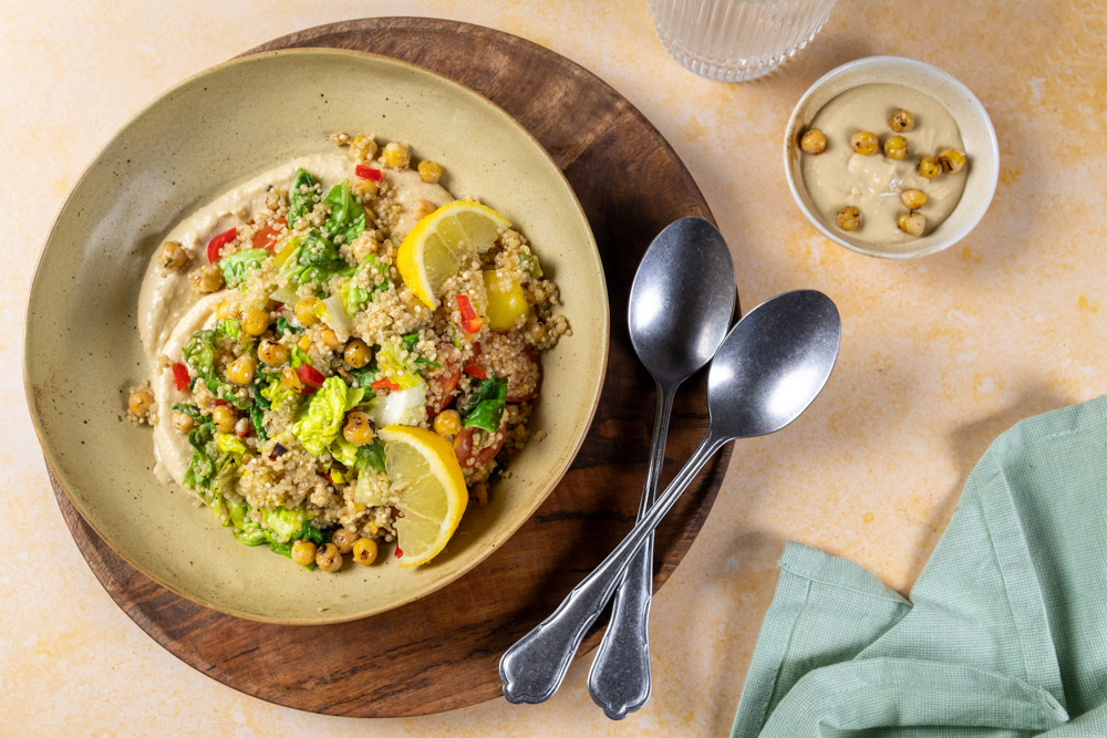 Équilibrée et ultra-nutritive, cette salade peut être un repas complet. Le quinoa ajoute des protéines, tandis que les légumes grillés apportent une touche fumée irrésistible. Le houmous crémeux, posé en quenelles sur le dessus, crée un contraste parfait avec la roquette. Une salade à la fois gourmande et saine. Et, entre nous, qui peut résister à une belle pyramide de houmous ?