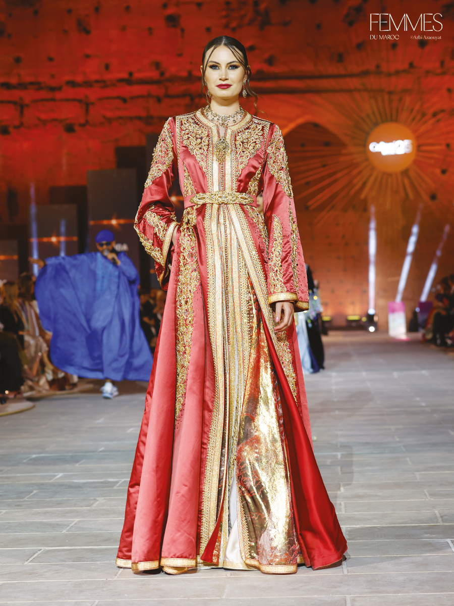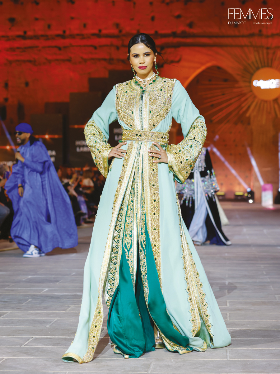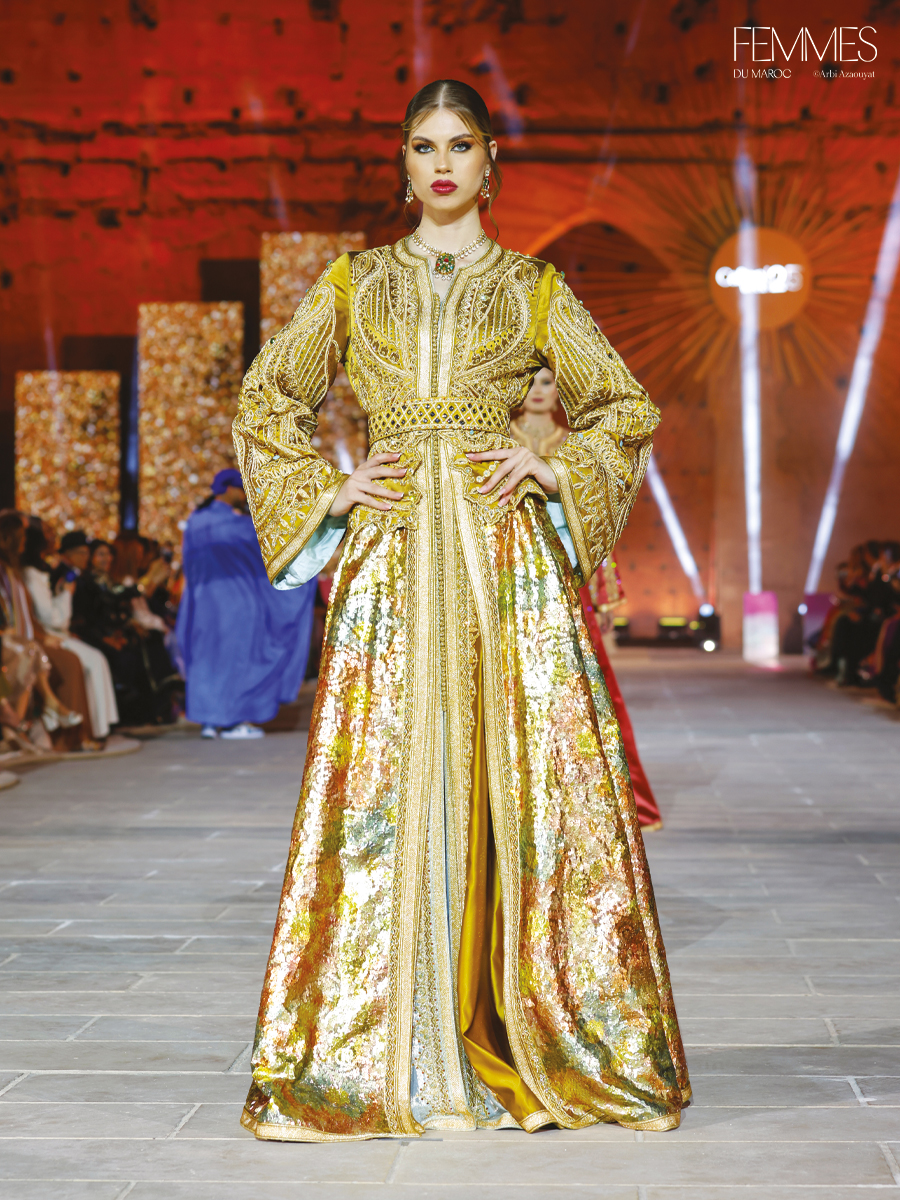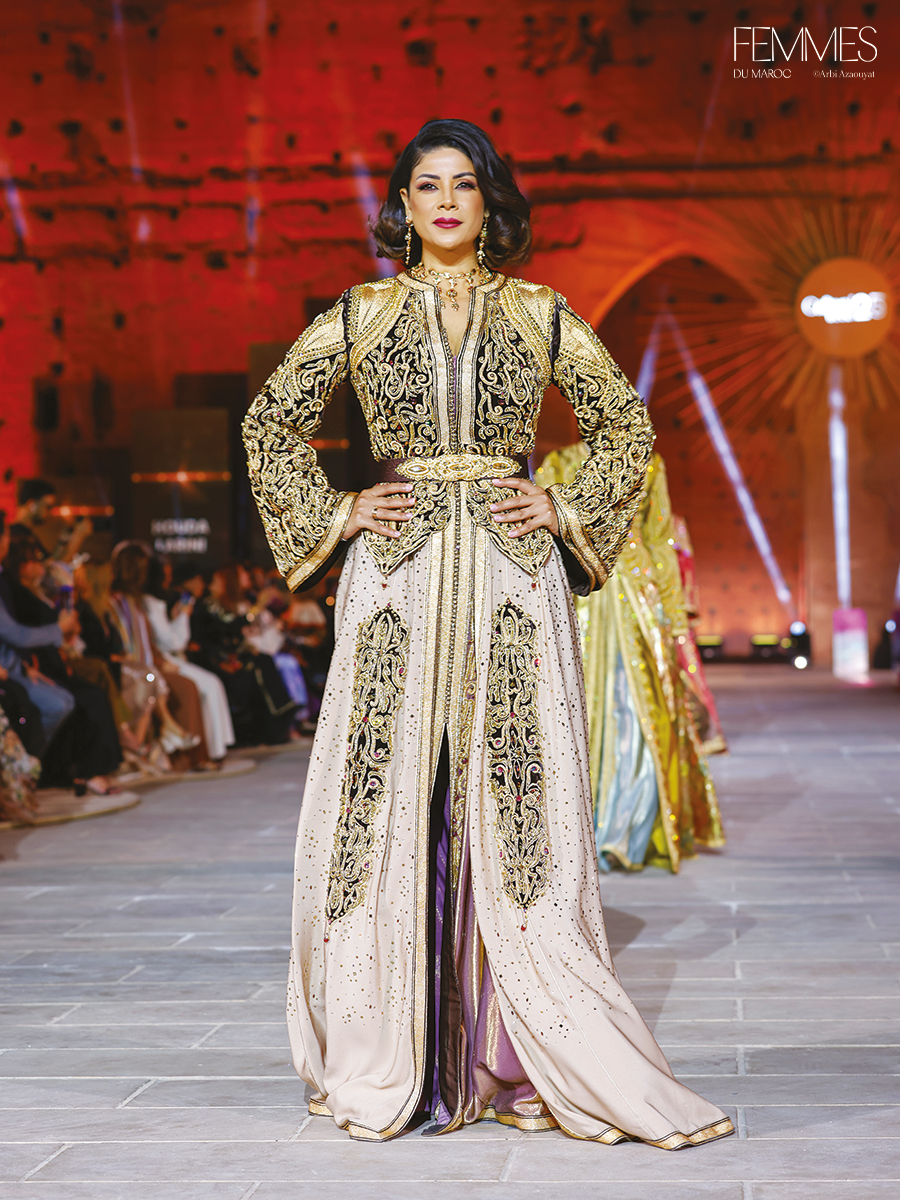 Le caftan qui me touche le plus est sans doute celui inspiré par le sable doré du désert. Il incarne à la perfection l’alliance entre tradition et modernité que je souhaite transmettre cette année. Sa coupe met en valeur la féminité tout en respectant les lignes traditionnelles, et sa couleur dorée évoque la chaleur du désert sous le soleil. J’ai utilisé une sfifa délicate et des motifs géométriques, des zwak mâalem, sur le corsage pour rappeler le savoir-faire ancestral. Ce caftan représente, selon moi, la femme sahraouie : forte, libre, fidèle à ses racines, tout en avançant avec confiance vers l’avenir.
