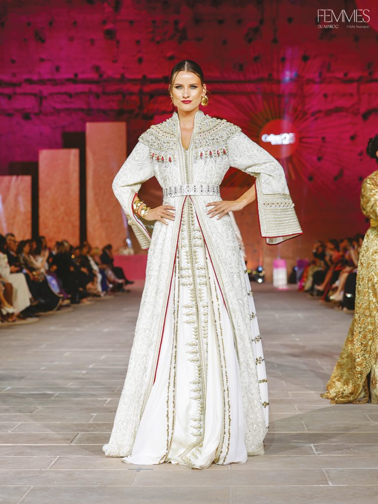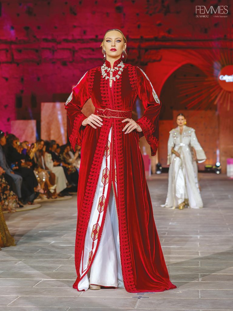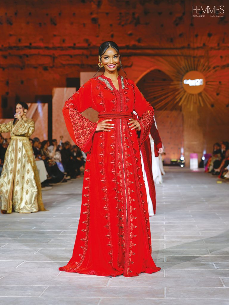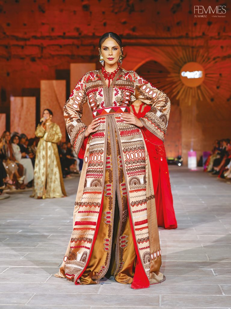 Le thème “Sahara” s’exprime dans chaque pièce, à travers les couleurs, les matières et les détails. Les teintes chaudes – terracotta, rouge ocre, brique – rappellent les nuances du désert, tandis que les textures variées et les broderies faites main évoquent la richesse et la délicatesse du savoir-faire artisanal marocain. Chaque caftan est une interprétation moderne de ce paysage intemporel. C’est une manière de faire voyager le regard, tout en ancrant chaque création dans une mémoire collective profondément marocaine.