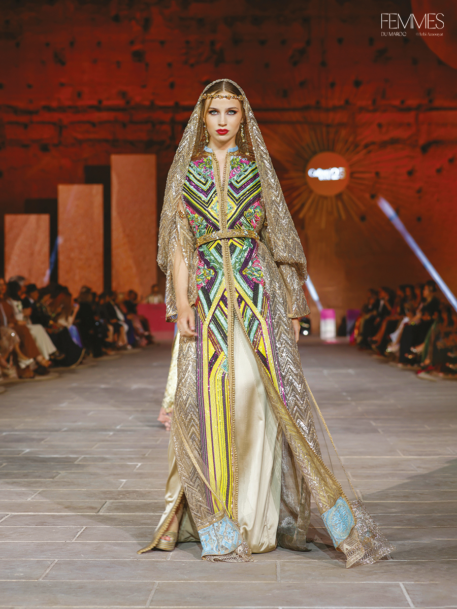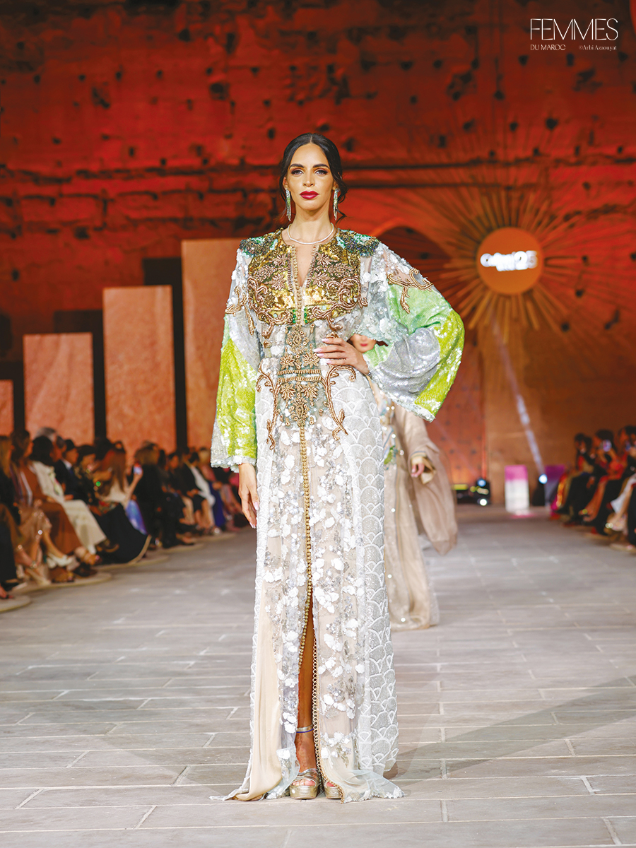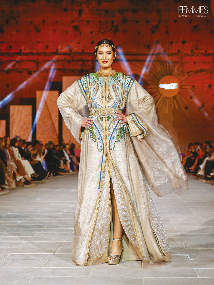 J’ai voulu que chaque pièce soit un écho du désert, un fragment de Sahara à porter. Les couleurs que j’ai choisies rappellent les nuances du crépuscule sur les dunes, les reflets du sable chauffé par le soleil, les ombres profondes projetées par la lumière lunaire. On retrouve des teintes chaudes – ocre, cuivre, doré – mais aussi des verts profonds qui évoquent les oasis, les dattiers, et ce thé qu’on partage comme un rituel sacré d’hospitalité. Côté matières, j’ai privilégié des tissus fluides et aériens, comme s’ils portaient en eux le souffle du vent du désert. Les drapés légers rappellent les mouvements du sable, doux et insaisissables. Même la sfifa a été pensée comme une trace, une empreinte ondulante, sculptée en hauteur, comme les crêtes des dunes. Chaque détail, chaque finition est une invitation à ressentir le Sahara plus qu’à le voir.