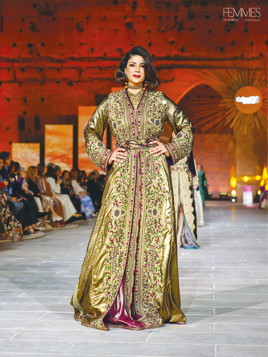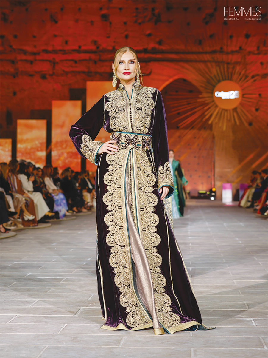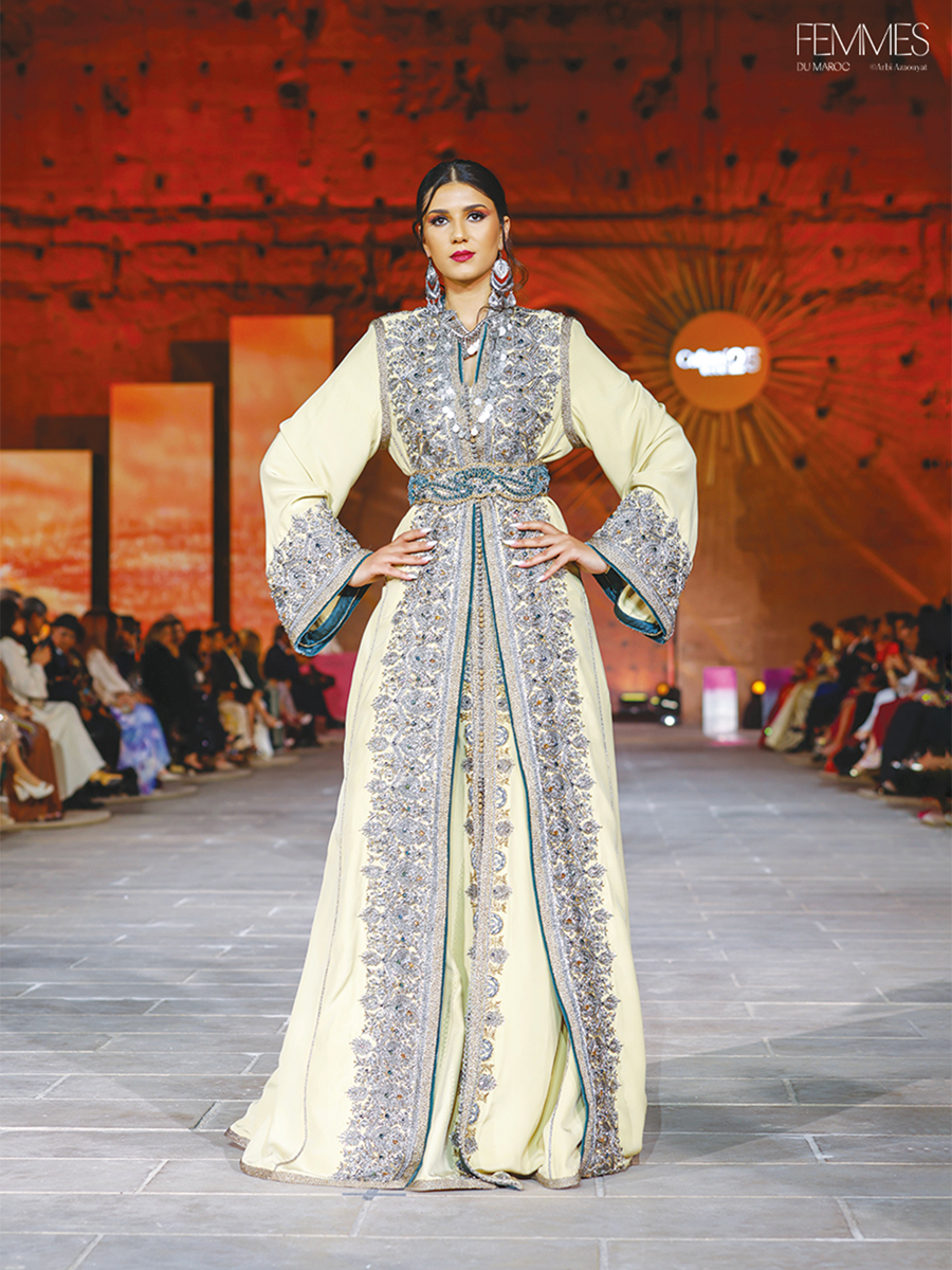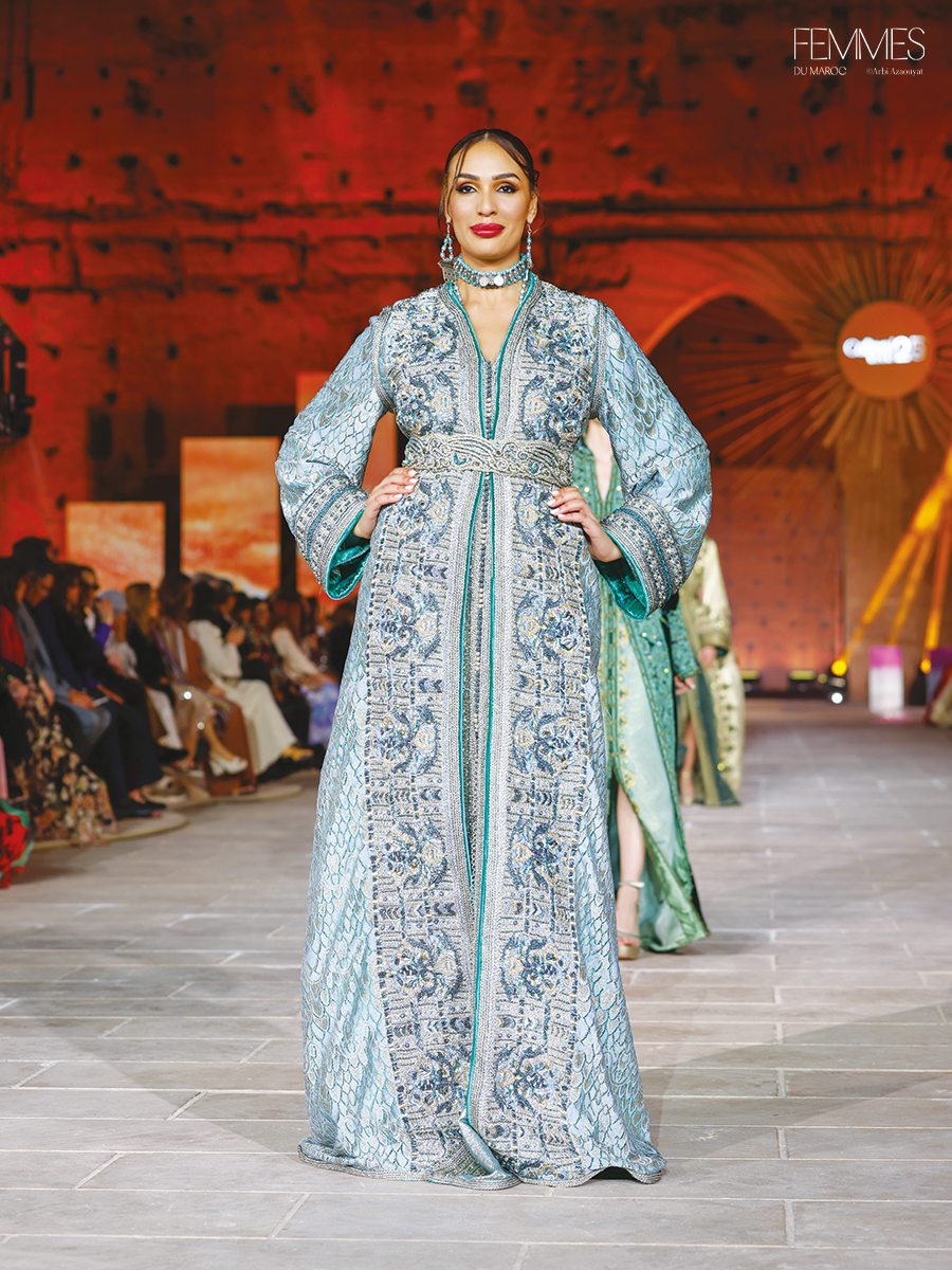 J’ai interprété ce thème comme une invitation à faire dialoguer le patrimoine saharien avec l’élégance du caftan traditionnel. À travers cette collection, j’ai voulu exprimer la force et la beauté du désert, en m’inspirant des motifs tribaux, des couleurs chaudes comme l’ocre et le sable, et des matières naturelles évoquant la vie nomade. C’est une manière de raconter une histoire culturelle riche, tout en la traduisant dans une couture moderne et raffinée.