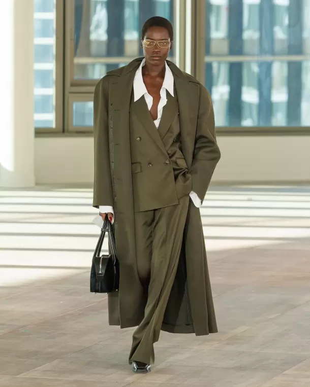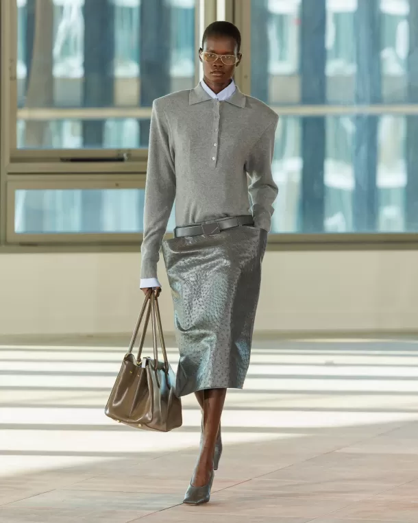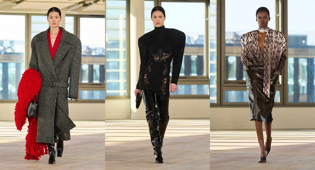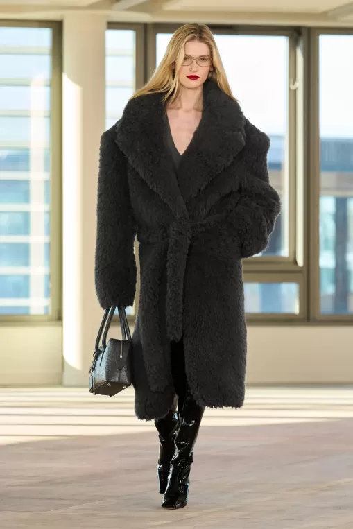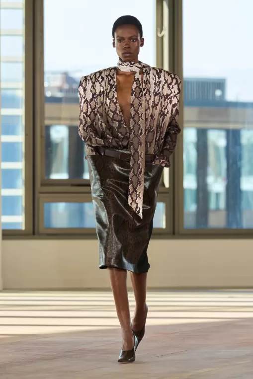 Grande défenseuse de la cause animale et d’une mode durable, Stella McCartney a mis en avant ses créations en cuir végétal, comme une grande blouse imitation peau de serpent ou une jupe qui combinait le cuir végétal à l’avant avec de la laine à l’arrière.