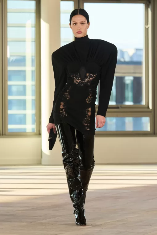 Avant le show, des danseuses ont déambulé parmi les invités qui prenaient possession de leurs sièges. Le défilé s’est achevé sur un court spectacle de pole dance, au rythme d’une musique disco, devant un parterre de célébrités dont la première dame française, le créateur Tom Ford ou encore les actrices Cameron Diaz et Olivia Colman.