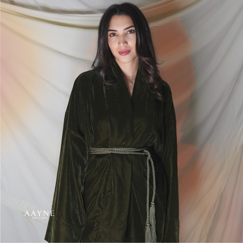 Côté matières, la fondatrice de la marque Aayne reste fidèle à deux textiles qu’elle affectionne particulièrement : le lin et le velours. « Le lin apporte une texture vivante et respirante tandis que le velours donne de la profondeur aux silhouettes », souligne-t-elle. La palette s’articule autour de tons terreux, naturels et apaisants, ponctués de touches plus vibrantes. « J’aimais l’idée de créer un équilibre entre sobriété et expression », confie-t-elle. Les coupes, elles aussi, privilégient la fluidité. « Les silhouettes sont pensées pour être flatteuses et gracieuses, sans être restrictives », explique-t-elle avec soin.